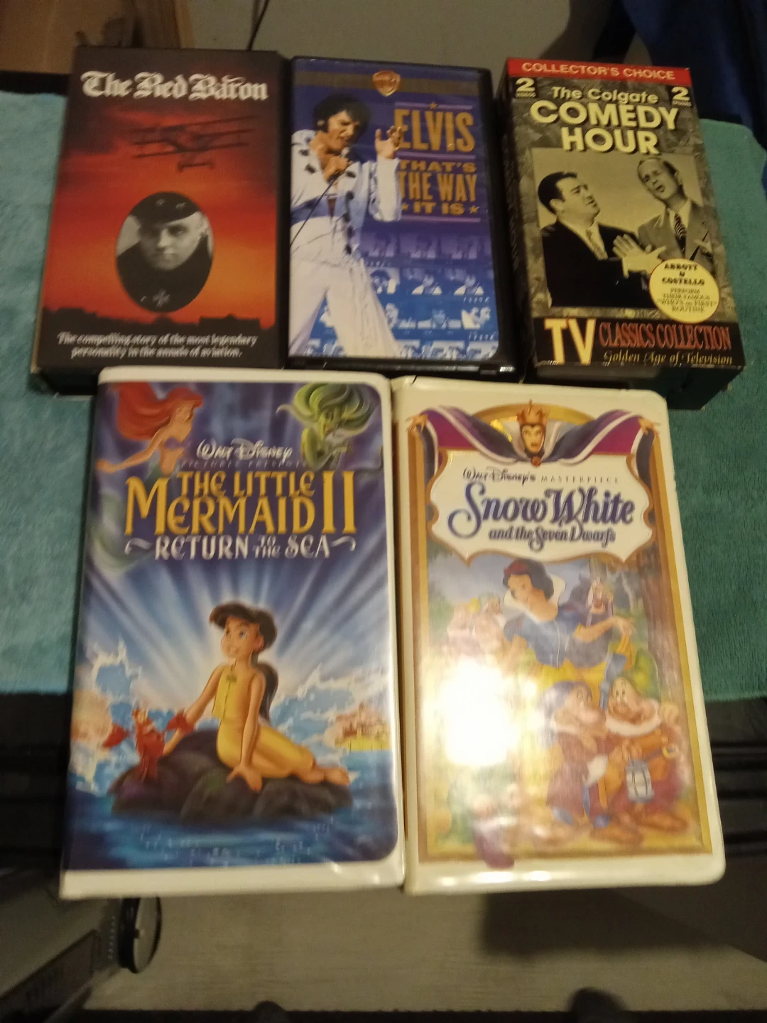 This collection includes five VHS tapes featuring a variety of genres. You'll get 'The Red Baron', 'Elvis: That's the Way It Is', 'Collector's Choice: The Colgate Comedy Hour', 'Disney's The Little Mermaid II: Return to the Sea', and 'Disney's Snow White and the Seven Dwarfs'. These tapes are great for nostalgic movie nights.
