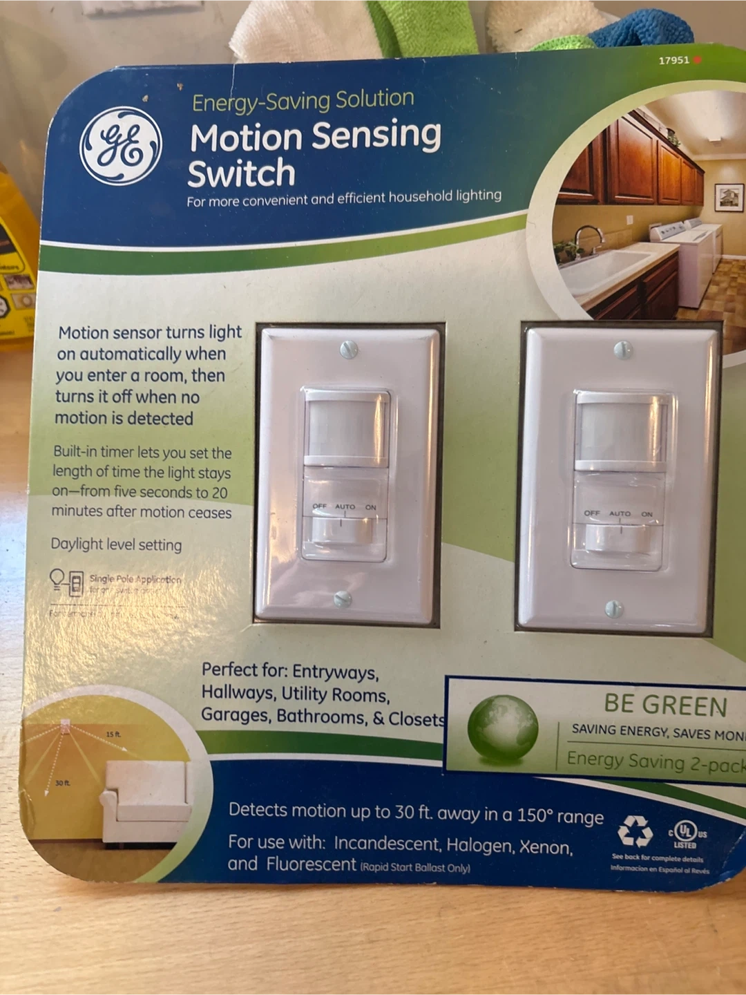 This GE Energy Saving 2-pack features motion sensing switches that turn lights on automatically when you enter a room and off when no motion is detected. They have a built-in timer that can be set from five seconds to 20 minutes. Detects motion up to 30 ft. away in a 150° range. These are perfect for entryways, hallways, utility rooms, garages, bathrooms, and closets.