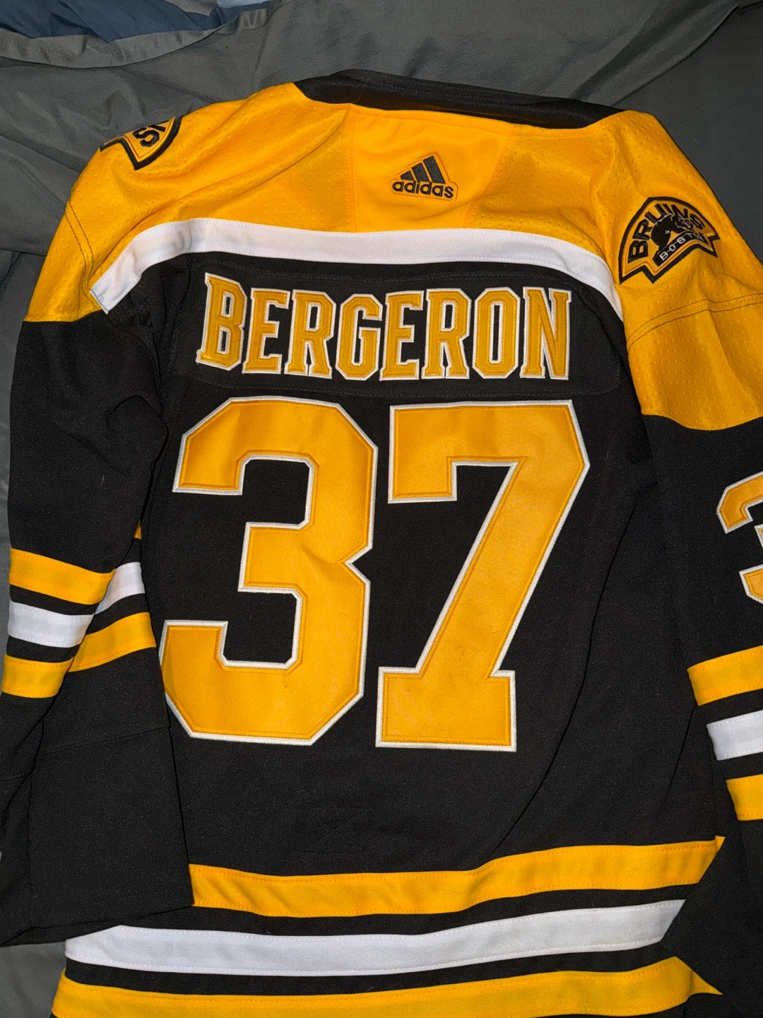 This is an Adidas Boston Bruins hockey jersey with Patrice Bergeron's name and number 37. Size 52. Barely worn, great condition.