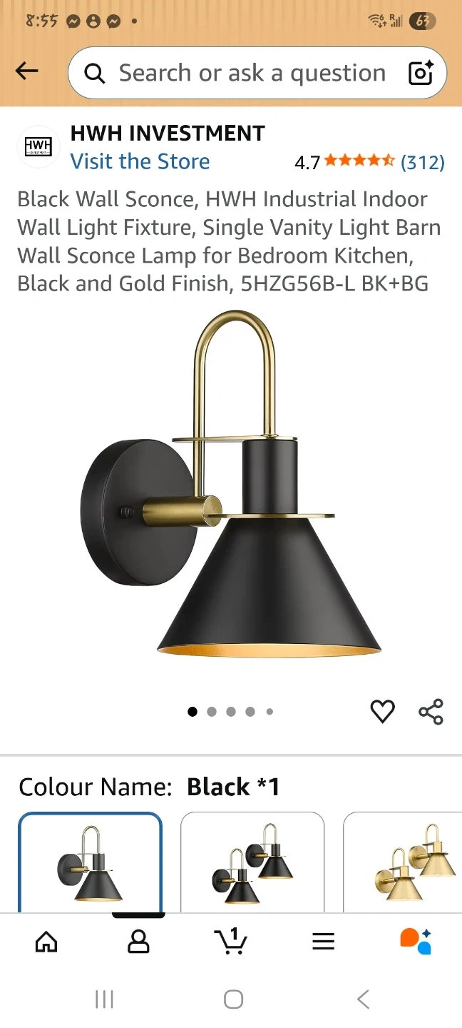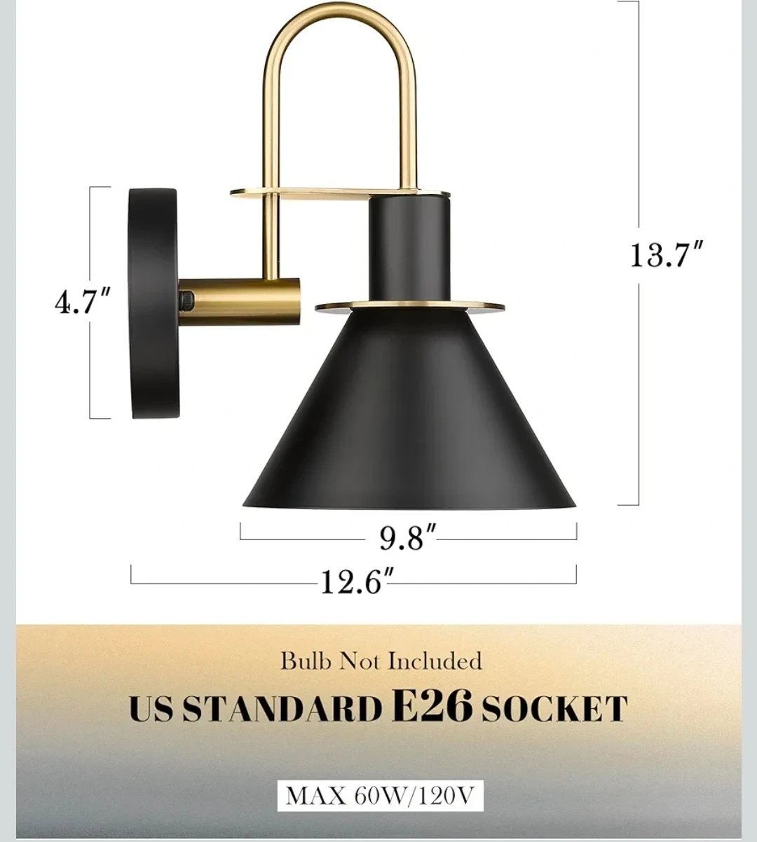 This industrial indoor wall sconce features a black and gold finish. It's a single vanity light barn sconce lamp, suitable for a bedroom, kitchen, or hallway. US standard E26 socket, max 60W/120V. Bulb not included. Dimensions: 13.7" H x 9.8" W x 12.6" D.