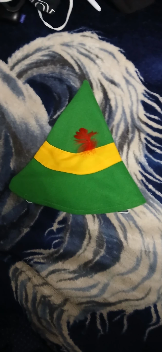 This is a green elf costume. It's a size L. Features gold embroidered accents on the front and white collar and cuffs.