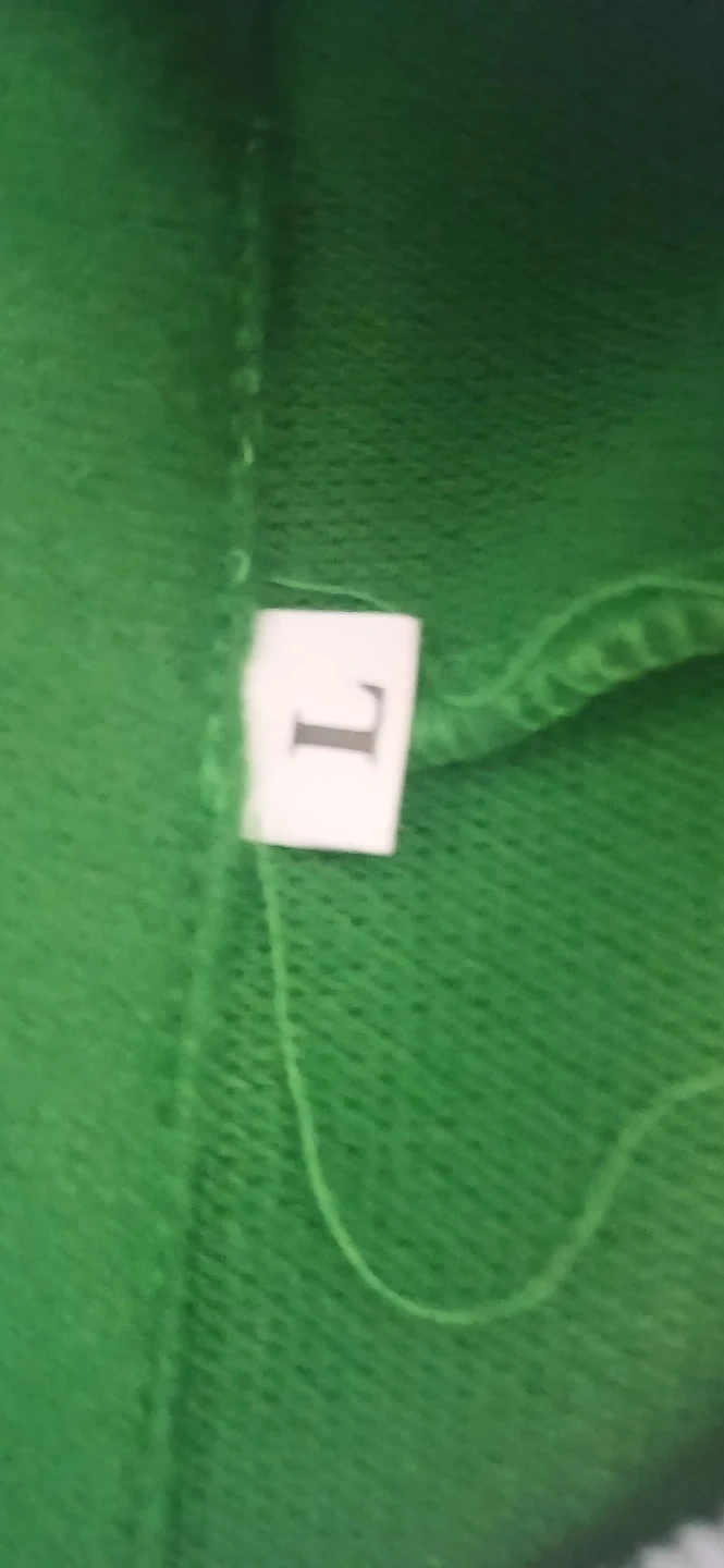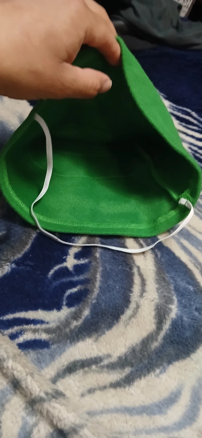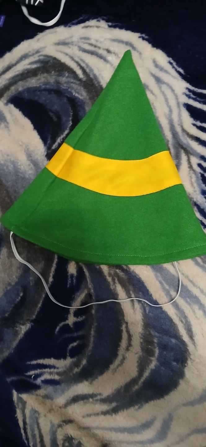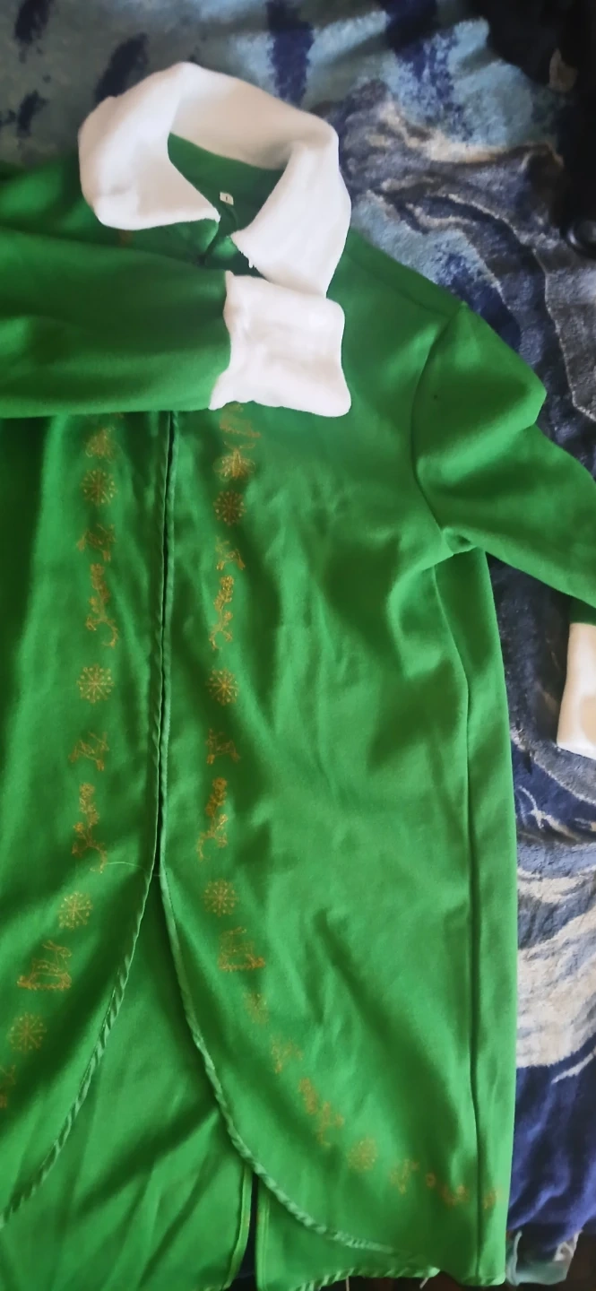 This is a green elf costume. It's a size L. Features gold embroidered accents on the front and white collar and cuffs.