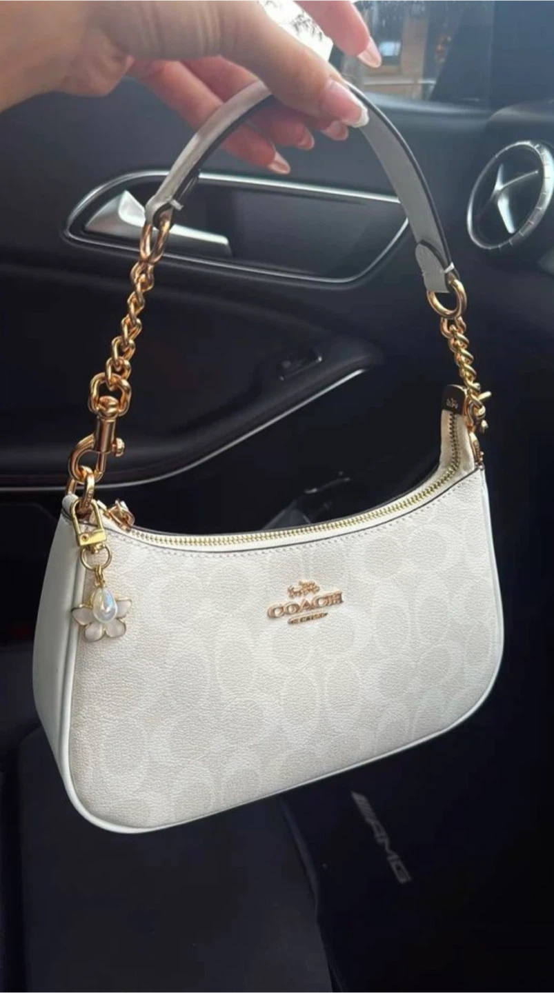 This is a classic Coach shoulder bag in white with the signature monogram pattern. It features a gold-tone chain strap and a decorative flower charm. Its compact size makes it perfect for carrying essentials.