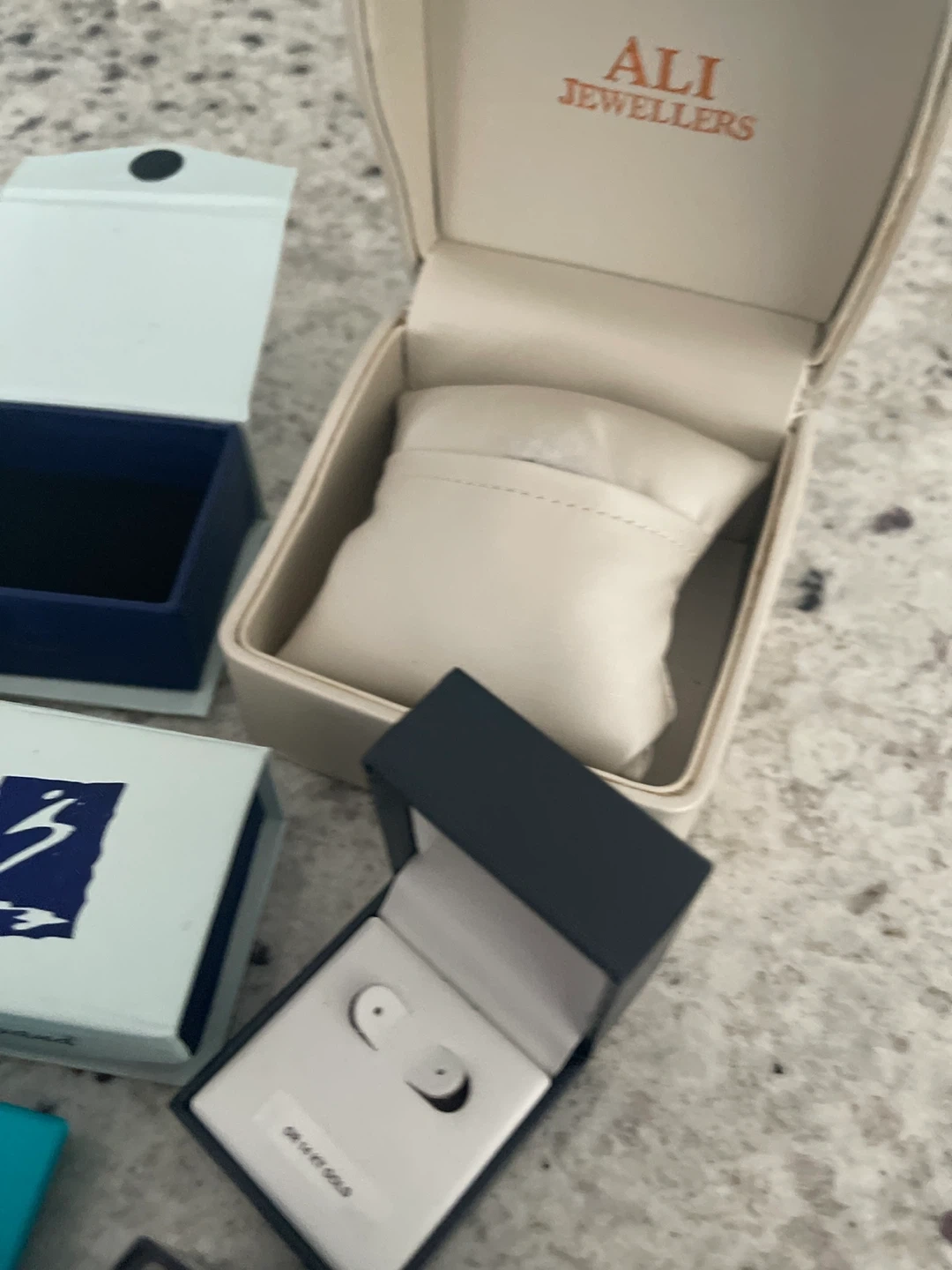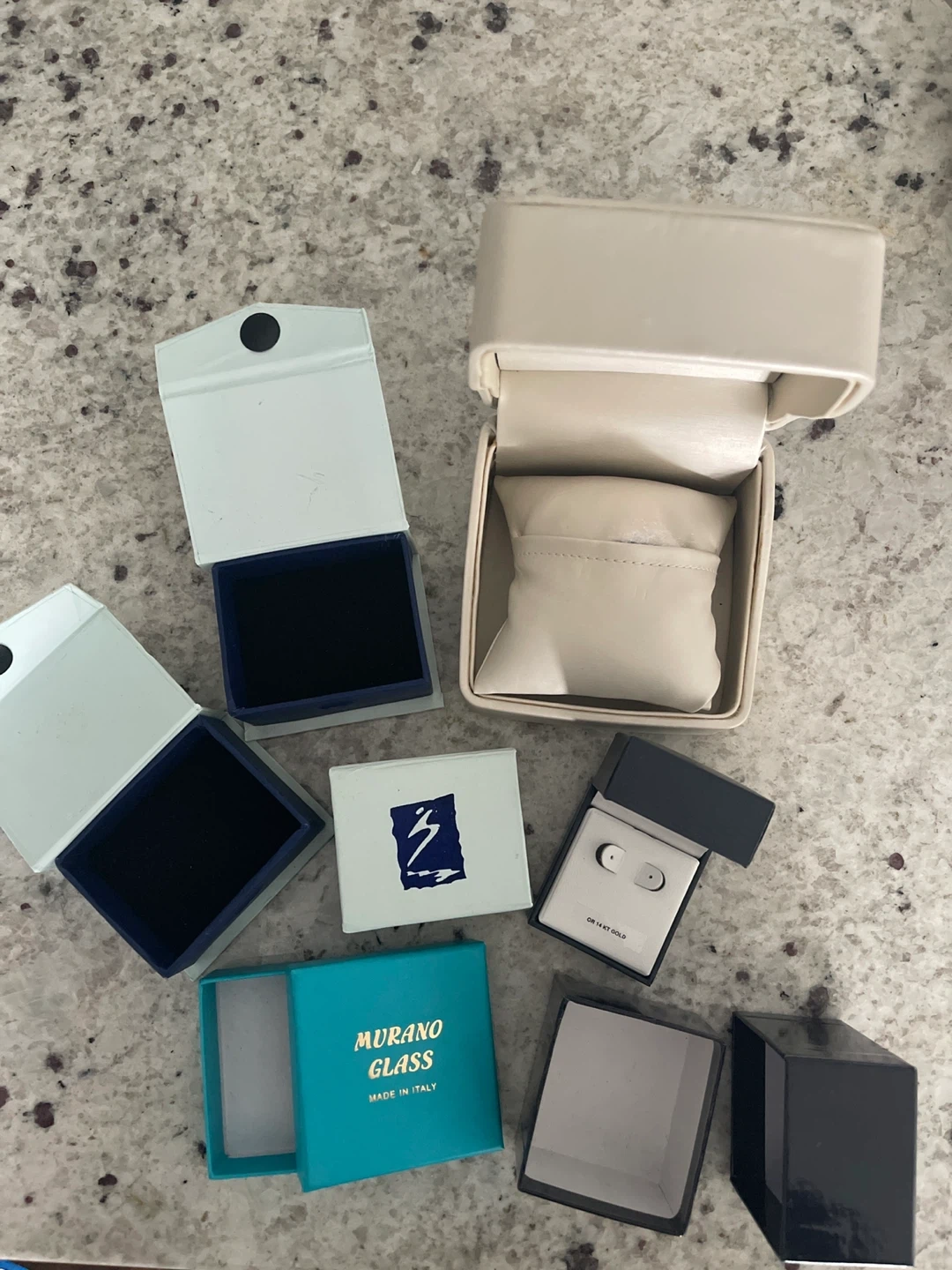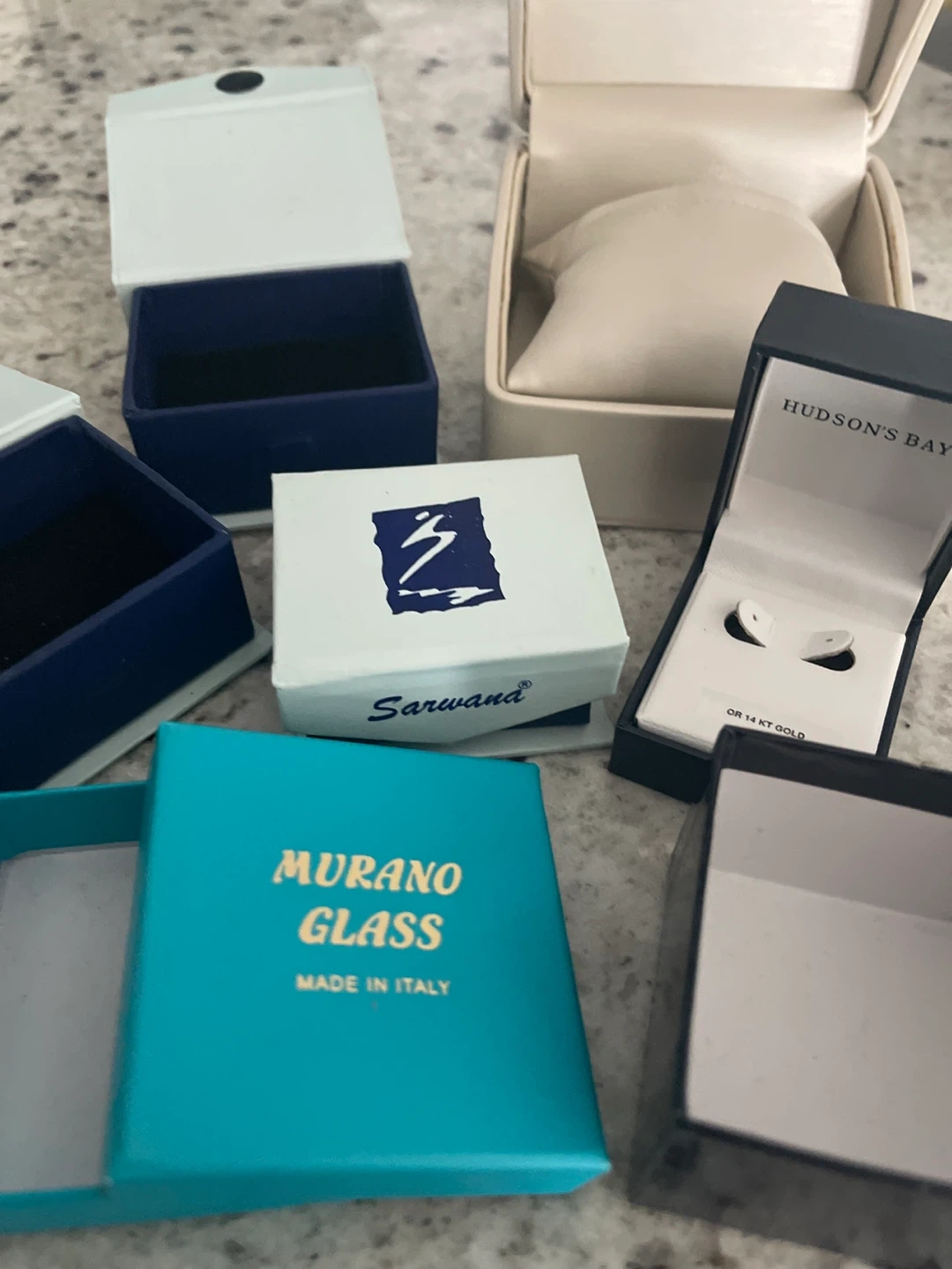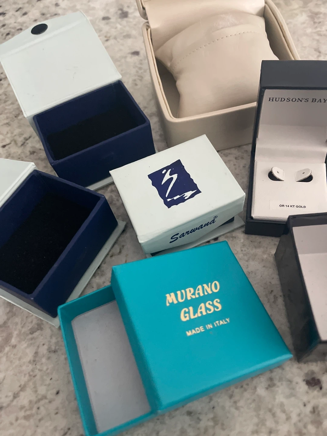 Collection of jewellery boxes including Murano Glass, Sarwana, Hudson's Bay, and Ali Jewellers. Some boxes are blue and white, others are teal and white. This assortment includes boxes for rings, earrings, and watches.