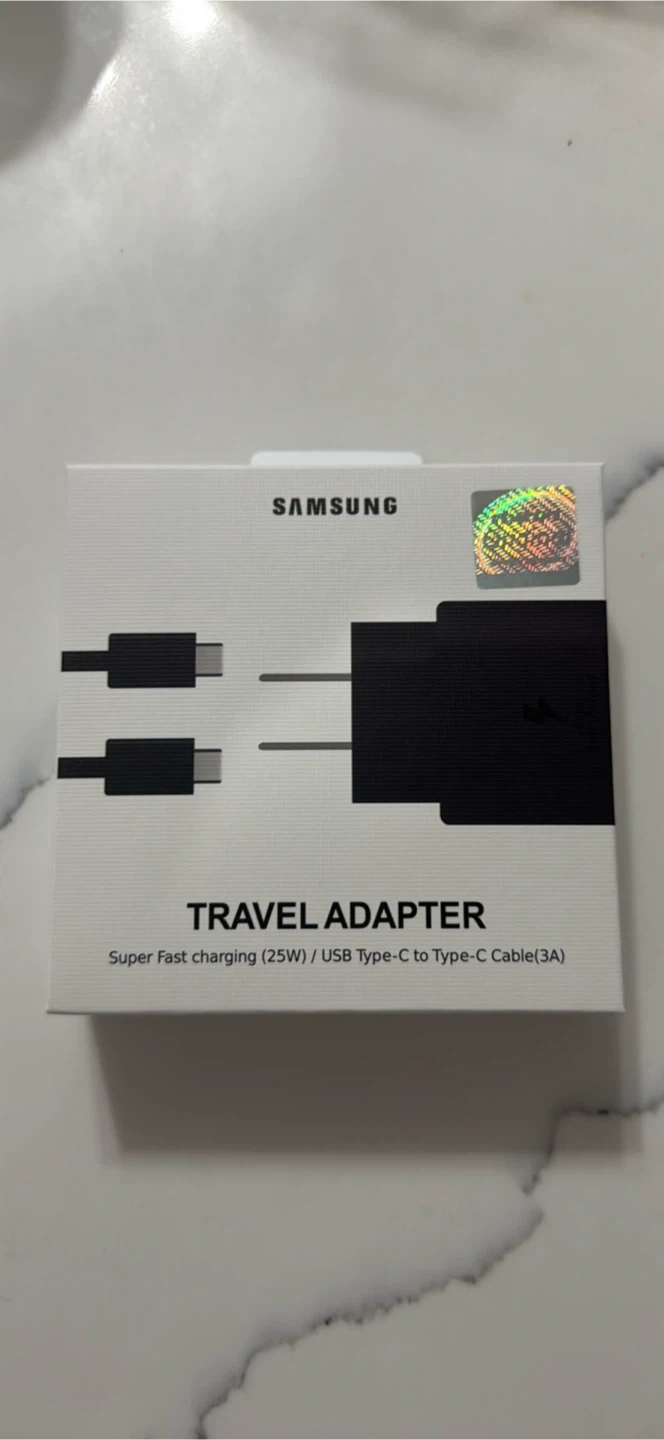 Selling a brand new Samsung Travel Adapter! It supports super fast charging (25W) and comes with a USB Type-C to Type-C cable (3A). The box is included