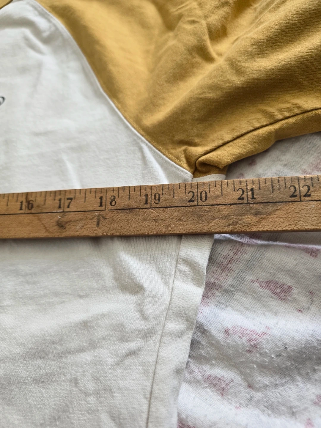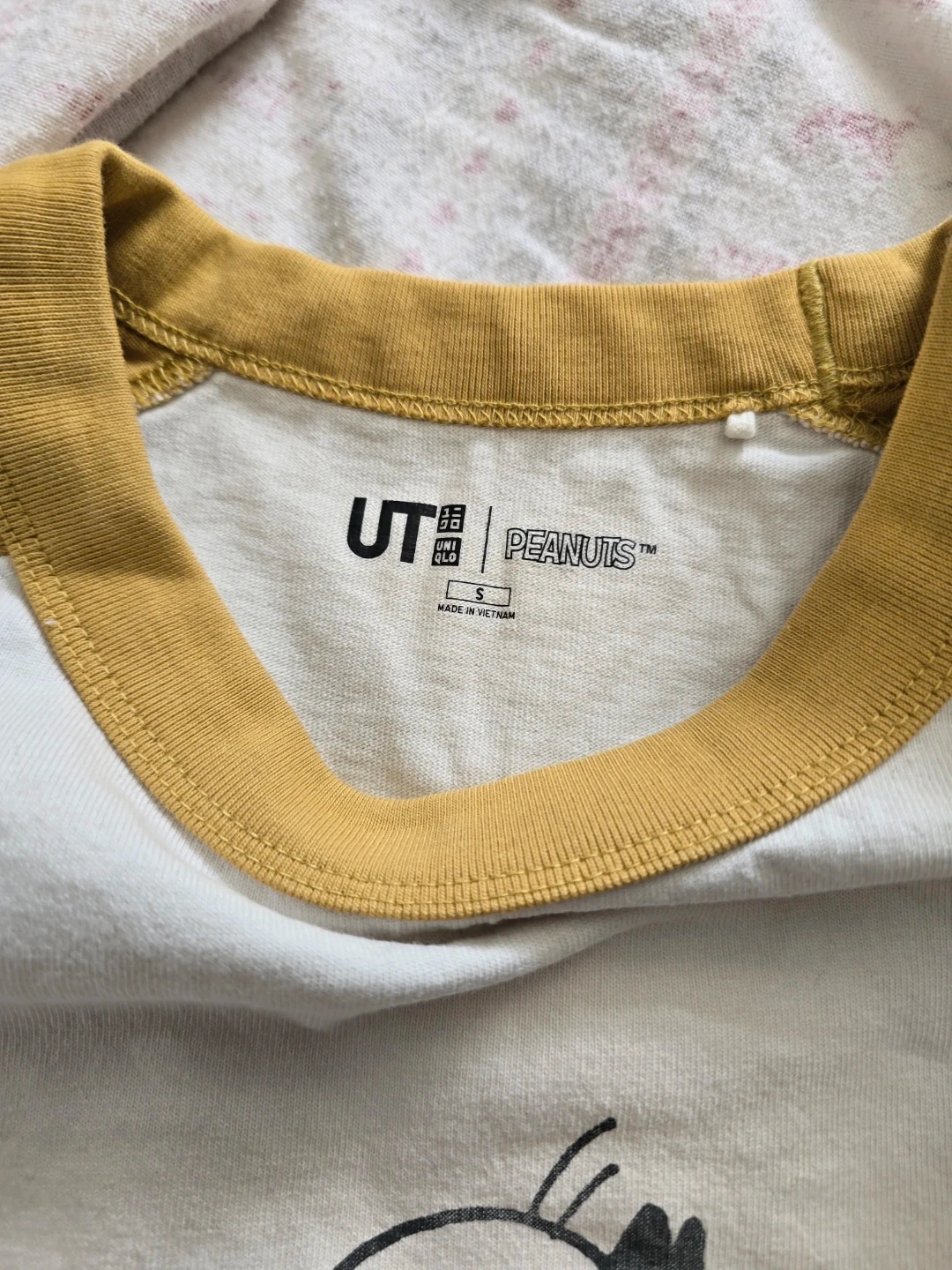 UNIQLO graphic t-shirt with a Peanuts Joe Cool design. Features contrast mustard yellow raglan sleeves. Made in Vietnam. Size is small.