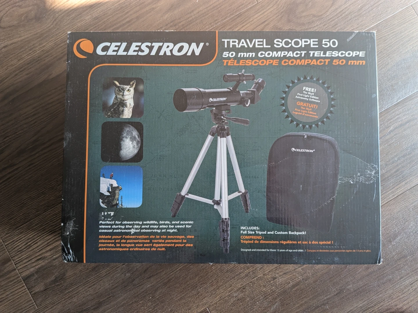 This Celestron Travel Scope 50 is a compact telescope perfect for observing wildlife, birds, and celestial objects at night. It includes a full-size tripod and a custom backpack for easy transport. A CD with First Light Edition software is also included.