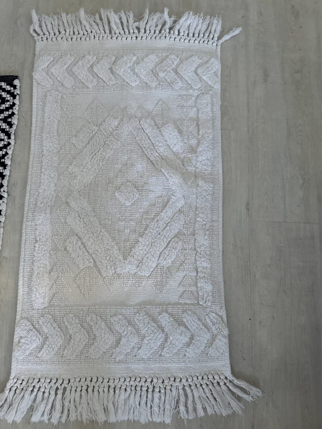 This white area rug features a tufted boho pattern with geometric accents. It has fringed edges on both ends. Perfect for adding a cozy texture to any room!