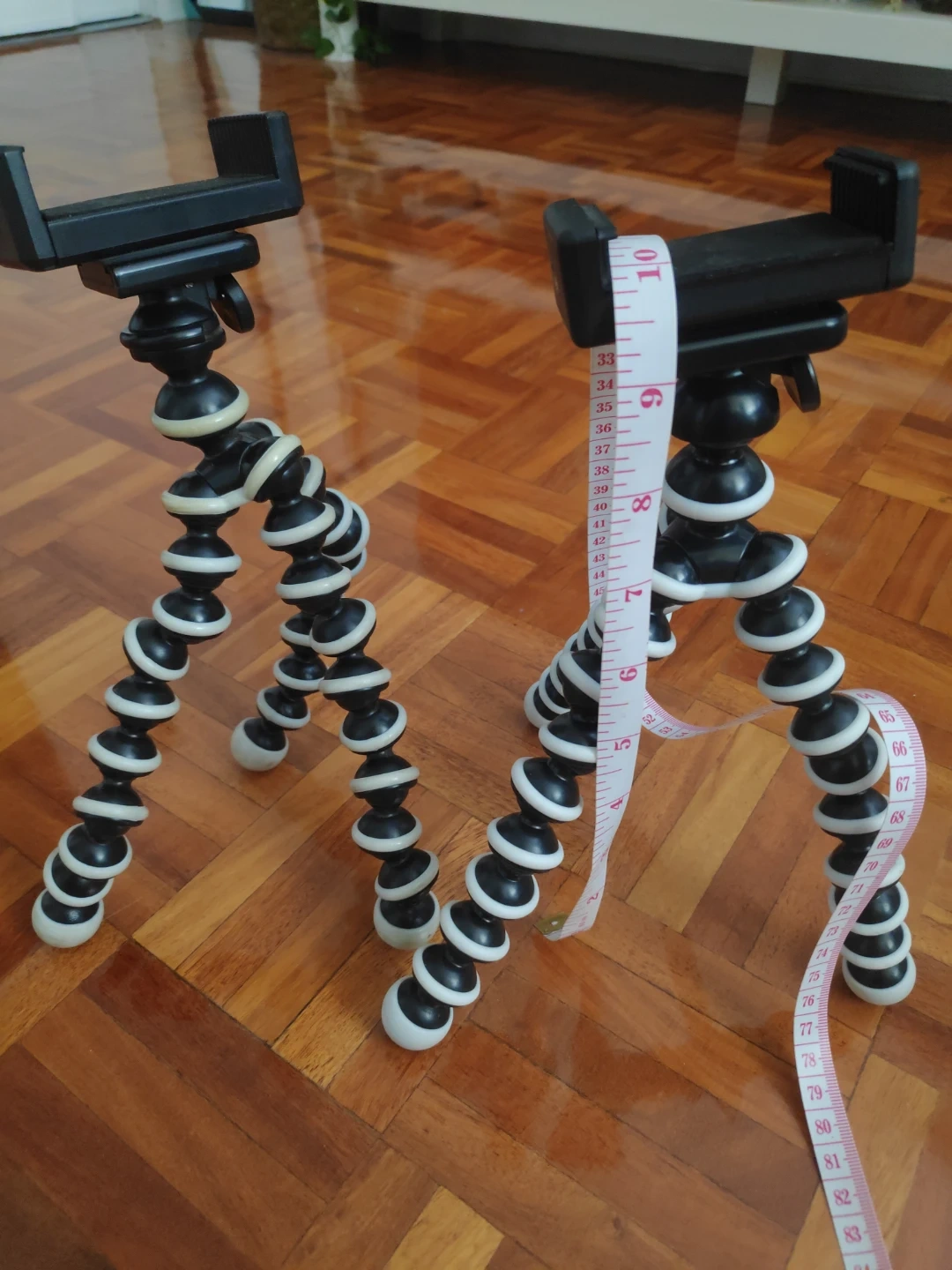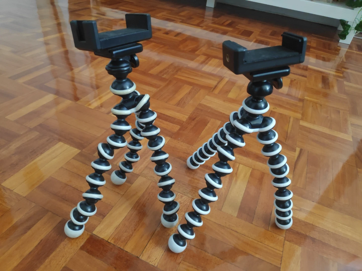 Selling a pair of flexible tripod stands for smartphones. They have adjustable legs for versatile positioning. One tripod measures approximately 10 inches in height. Plastic and rubber construction.