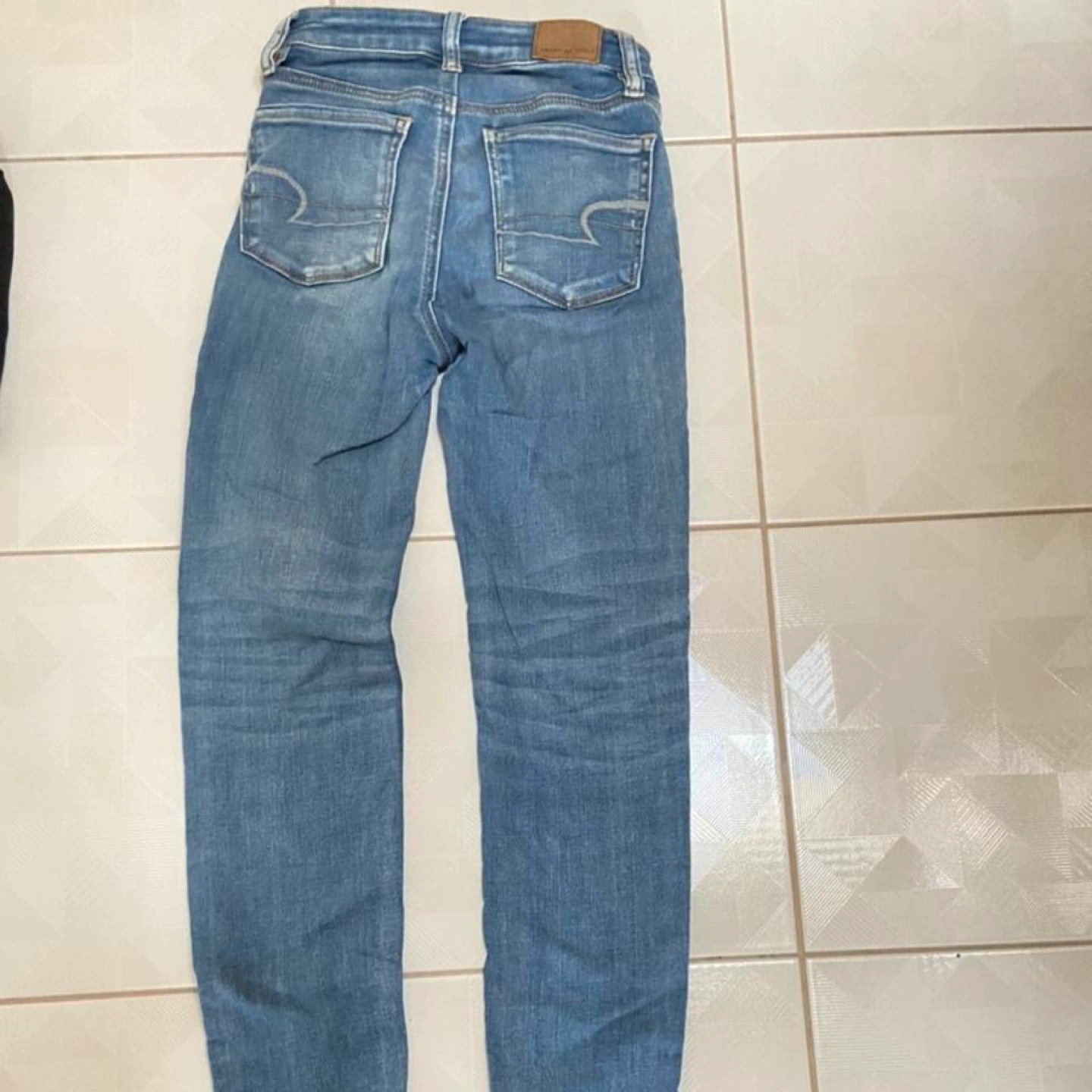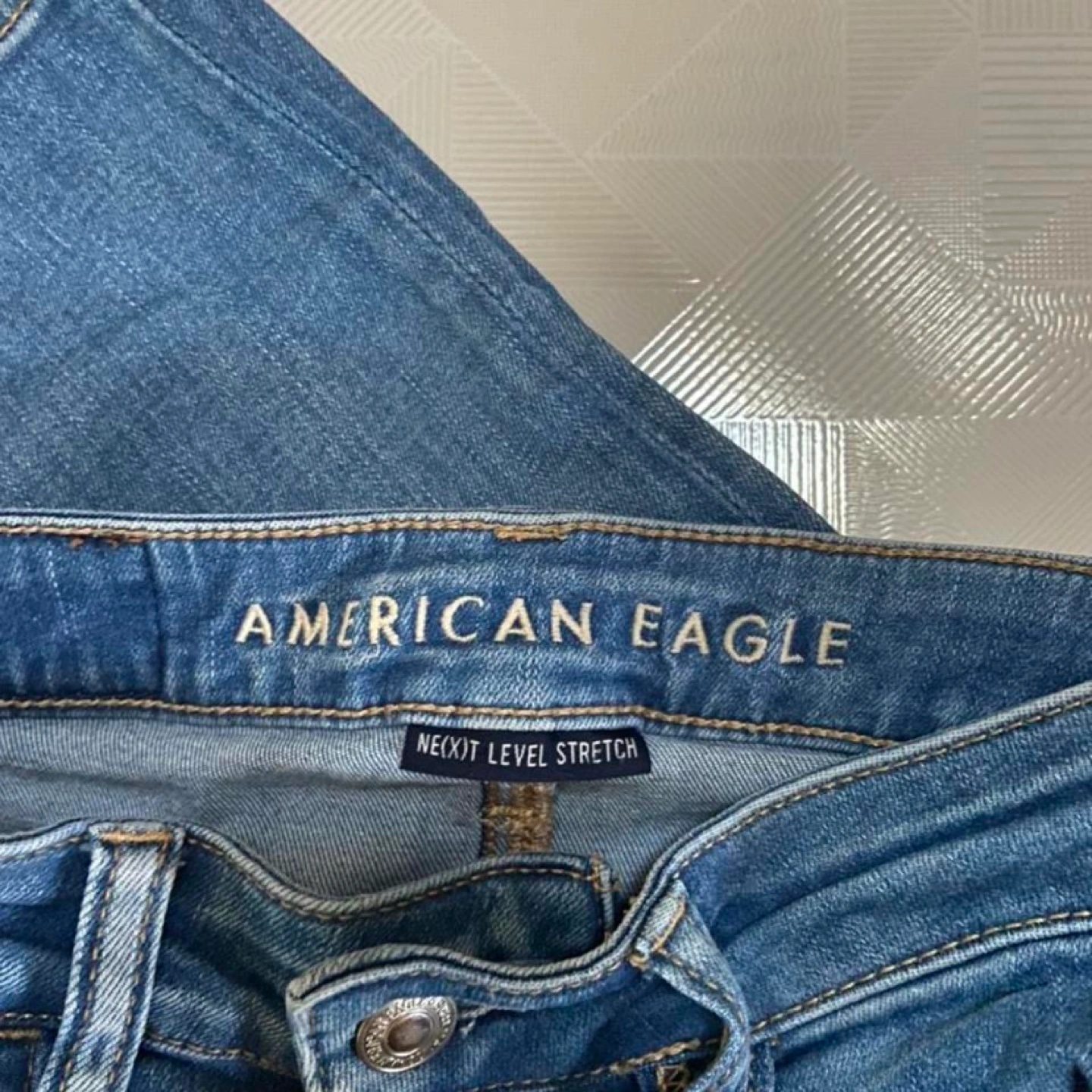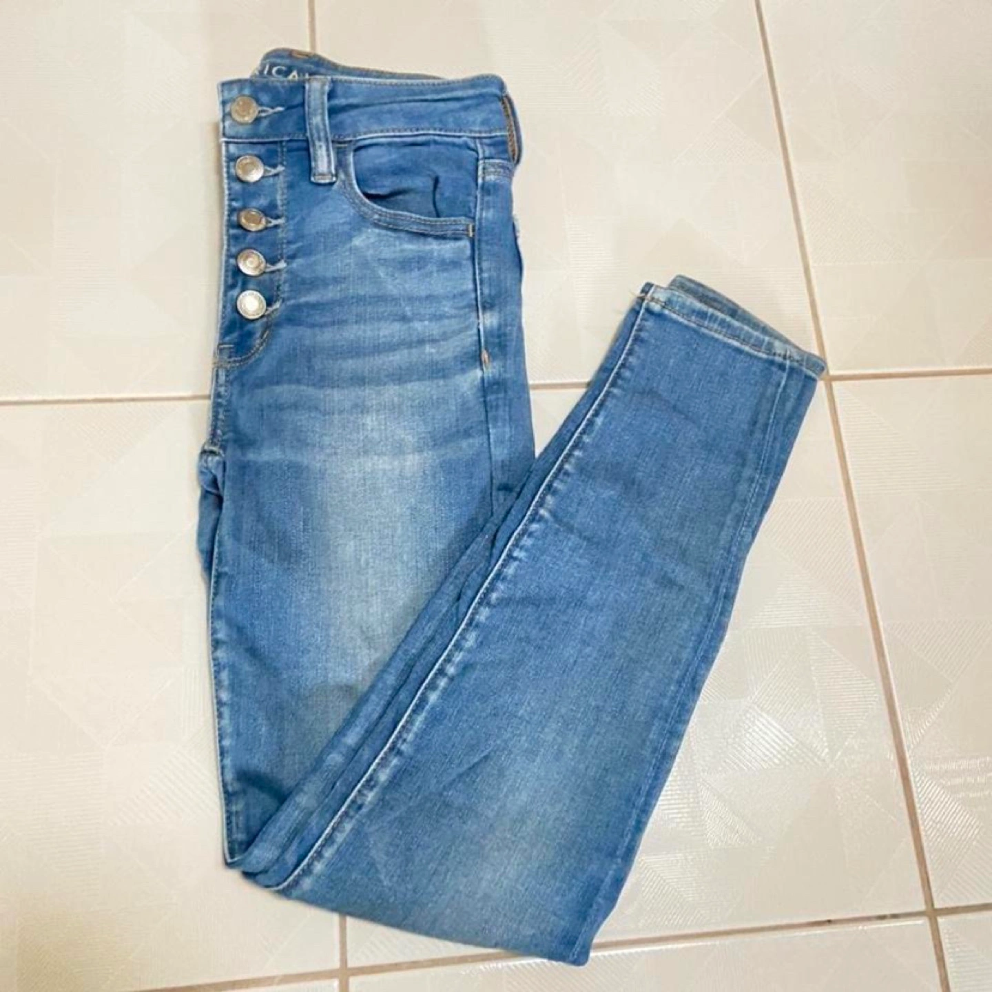 Blue American Eagle Next Level Stretch Highrise Jeggings light wash jeans.