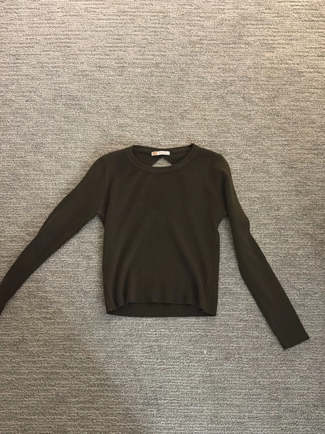This is a used sweater in good condition. It features a long-sleeved design with a unique cutout detail in the back, adding a touch of modern style to a classic silhouette. This olive green sweater is a versatile piece that can be dressed up or down, perfect for layering or wearing on its own, ready to add a subtle flair to your wardrobe. If the ad is up, it's available!