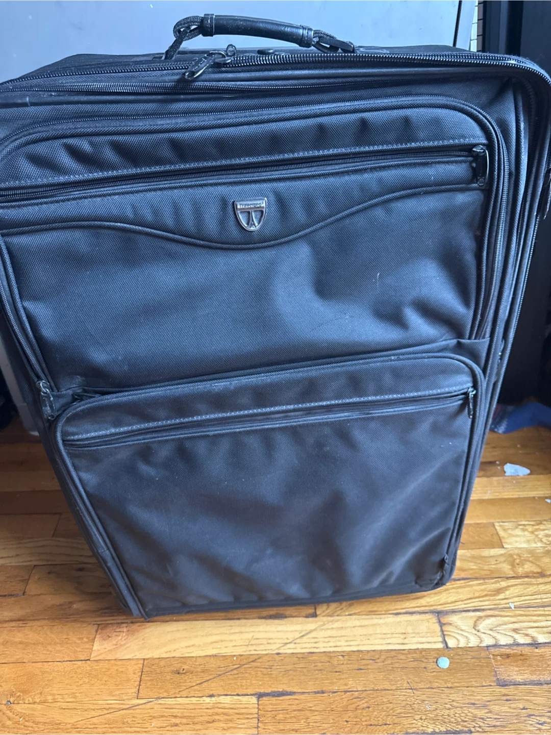 This is a black Travelpro softside rolling luggage bag. It has multiple zippered compartments for storage. Its durable construction makes it ideal for travel.