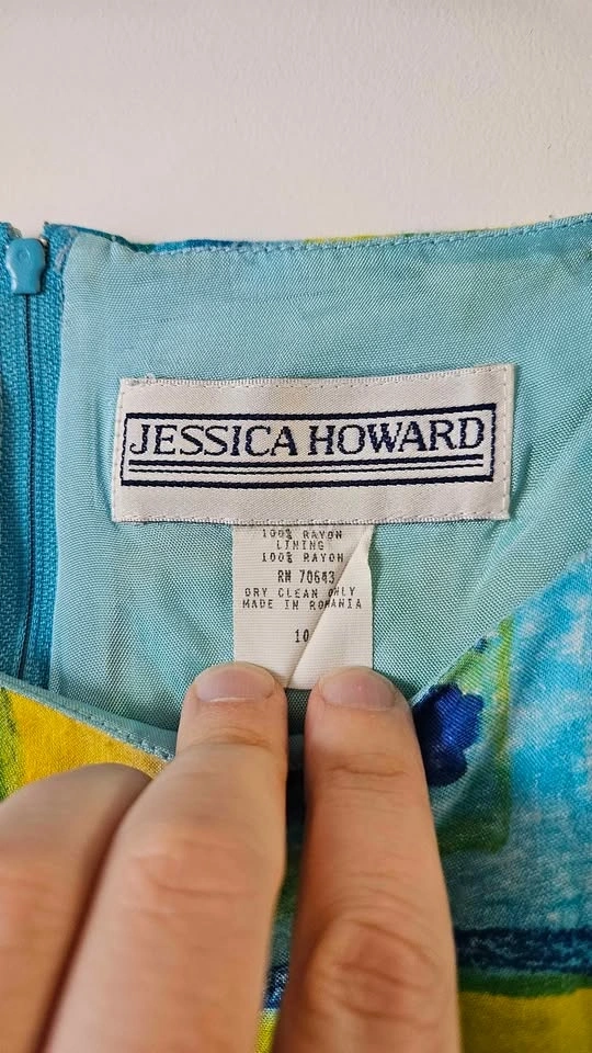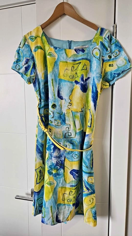 Vibrant Jessica Howard dress with a fun abstract print in blue, yellow, and green. It is 100% rayon with a rayon lining and comes with a yellow belt. This is a size 10. Dry clean only. Made in Romania.