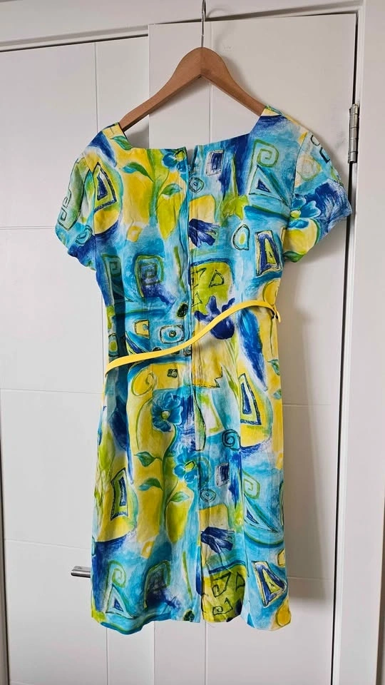 Vibrant Jessica Howard dress with a fun abstract print in blue, yellow, and green. It is 100% rayon with a rayon lining and comes with a yellow belt. This is a size 10. Dry clean only. Made in Romania.
