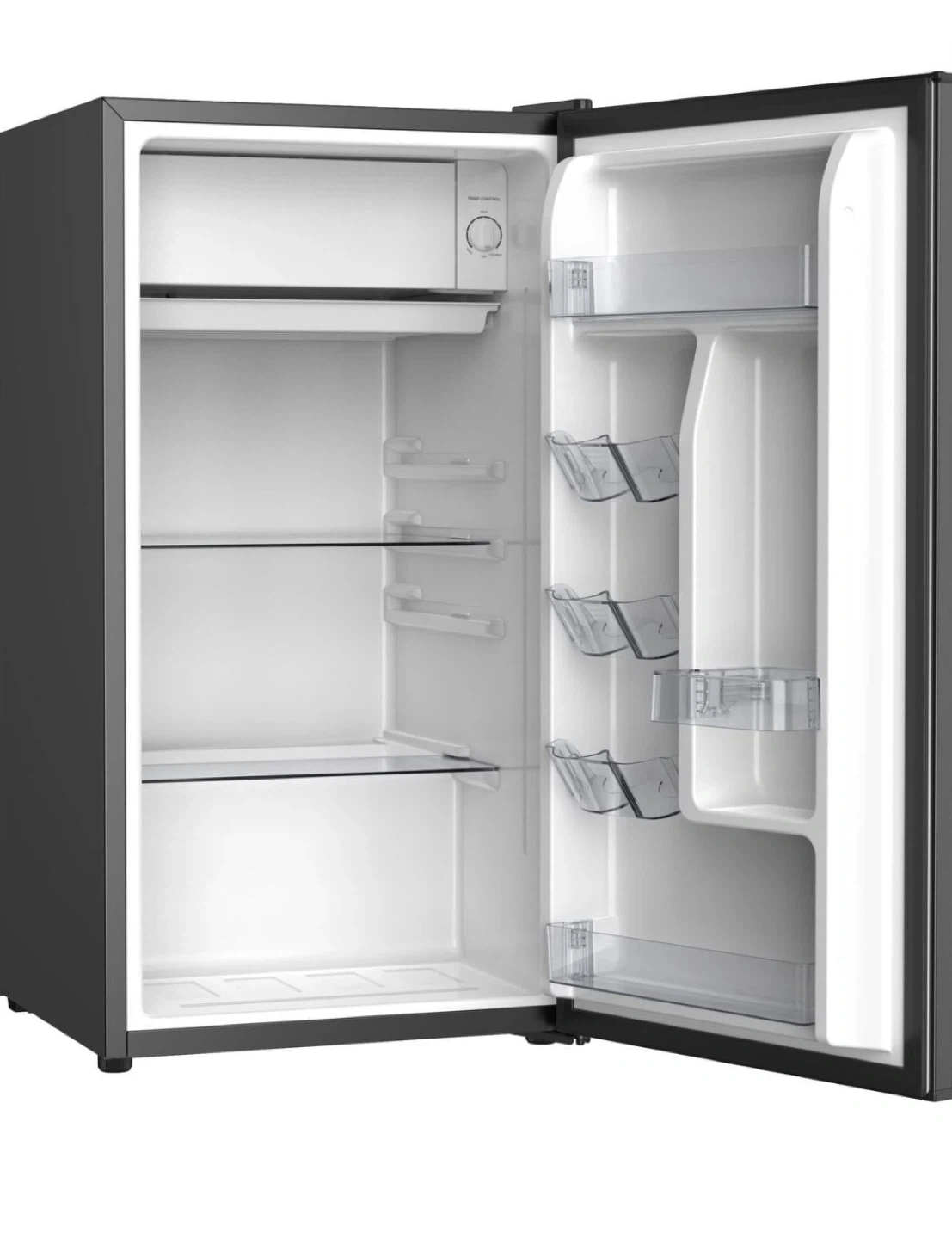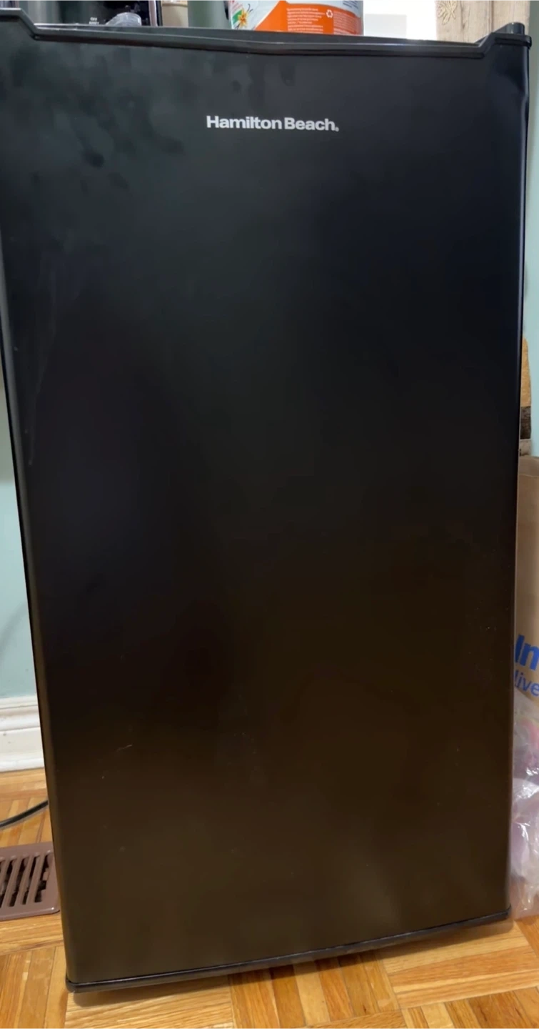 Hamilton Beach compact refrigerator in black. It has adjustable temperature control and reversible door. Interior includes shelving and door bins. Inside is still have wrapping.