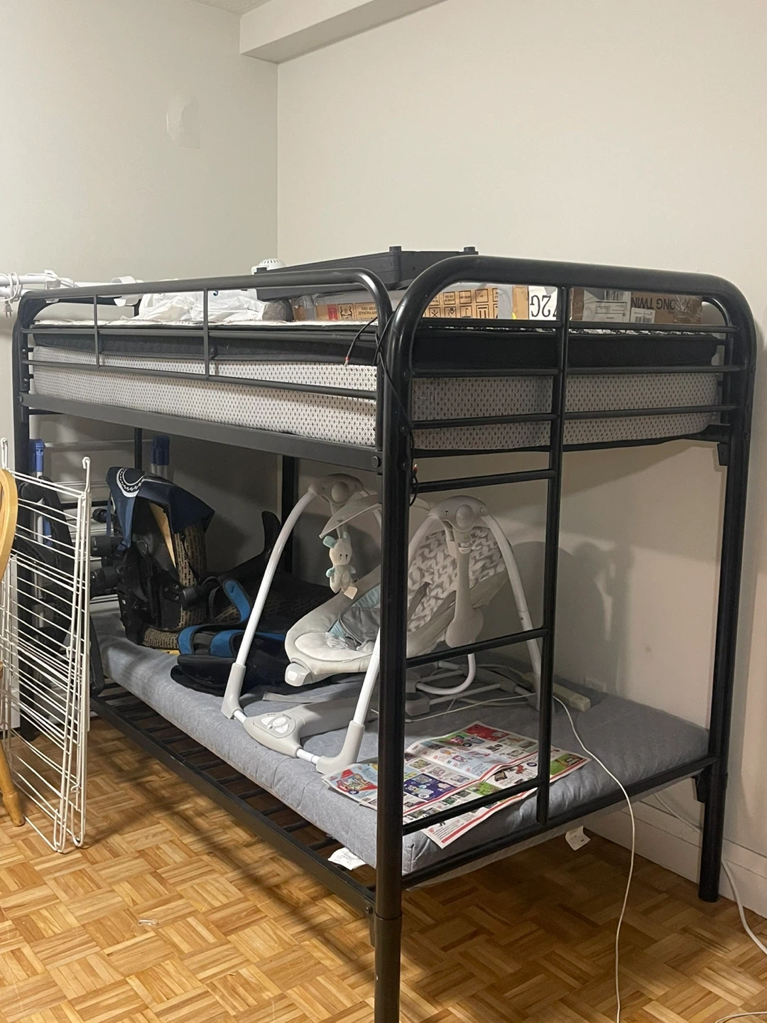 Selling a black metal bunk bed frame! It's sturdy and in great shape, perfect for saving space in a bedroom. The frame is easy to assemble and disassemble, making it convenient for moving. It's a great option if you're looking for a practical and durable bunk bed frame