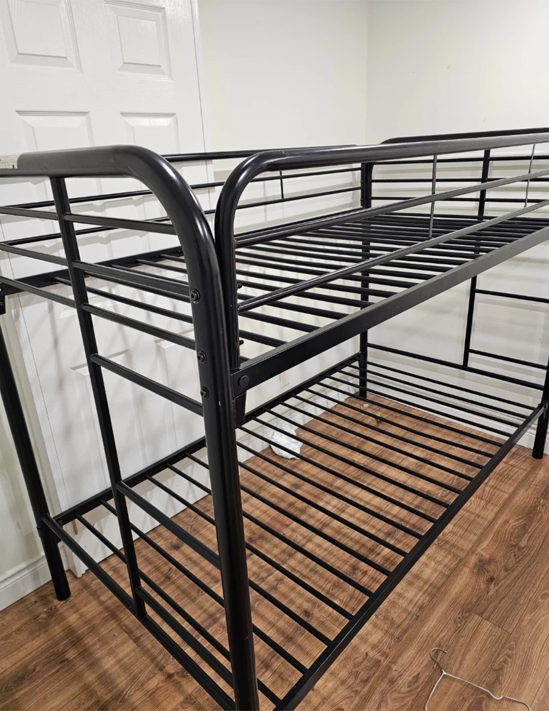 Selling a black metal bunk bed frame! It's sturdy and in great shape, perfect for saving space in a bedroom. The frame is easy to assemble and disassemble, making it convenient for moving. It's a great option if you're looking for a practical and durable bunk bed frame