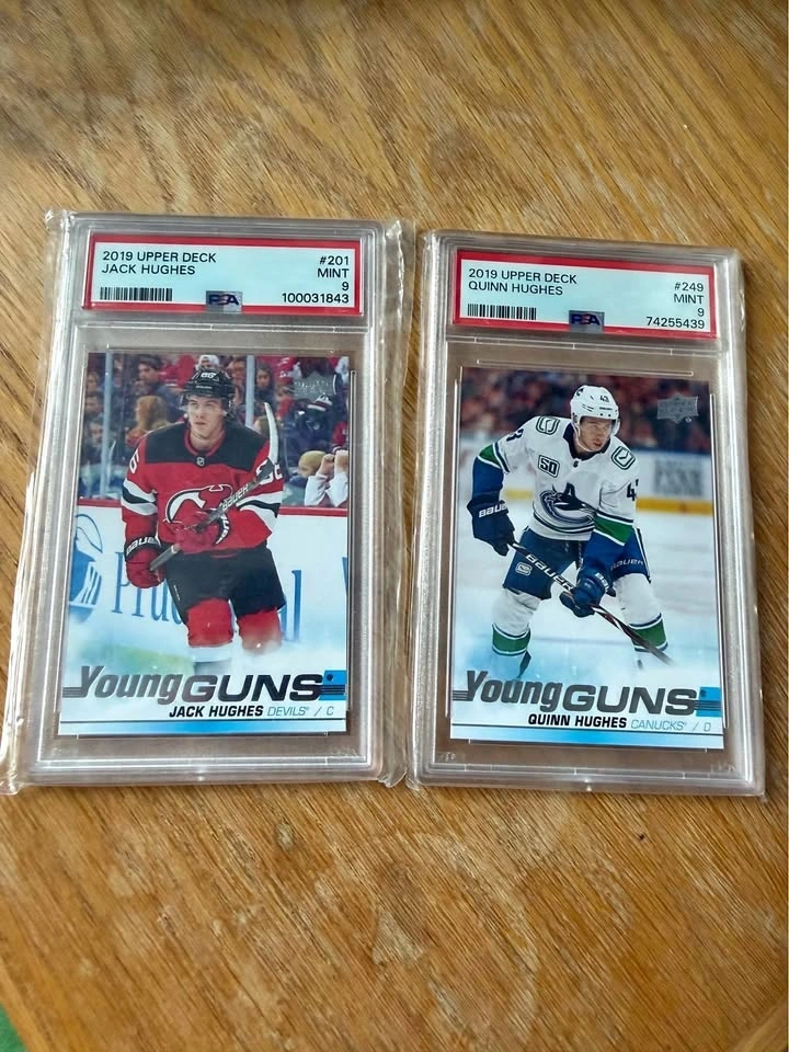 Amazing hockey card set! Has 2019 Upper Deck Young Guns of Jack Hughes and Quinn Hughes. Both cards are graded PSA 9 Mint. Great for any collector.
