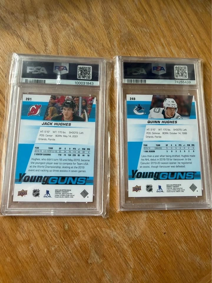 Amazing hockey card set! Has 2019 Upper Deck Young Guns of Jack Hughes and Quinn Hughes. Both cards are graded PSA 9 Mint. Great for any collector.