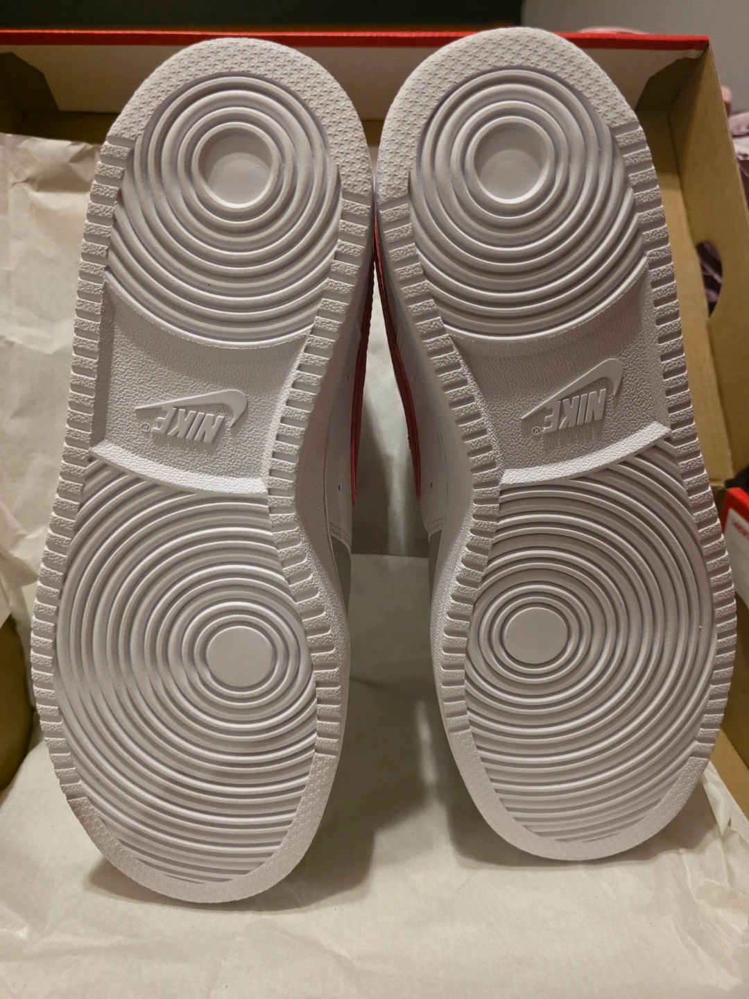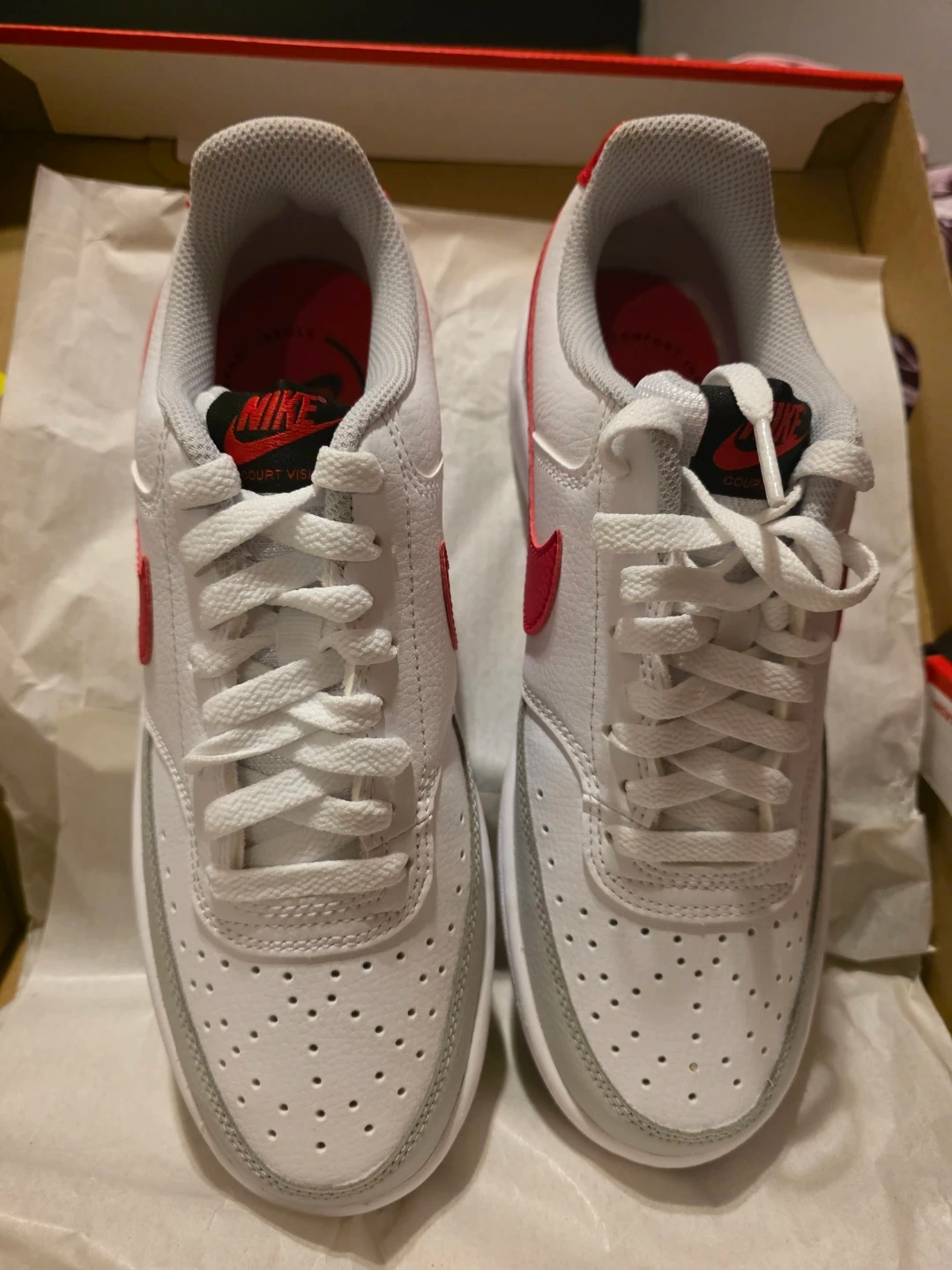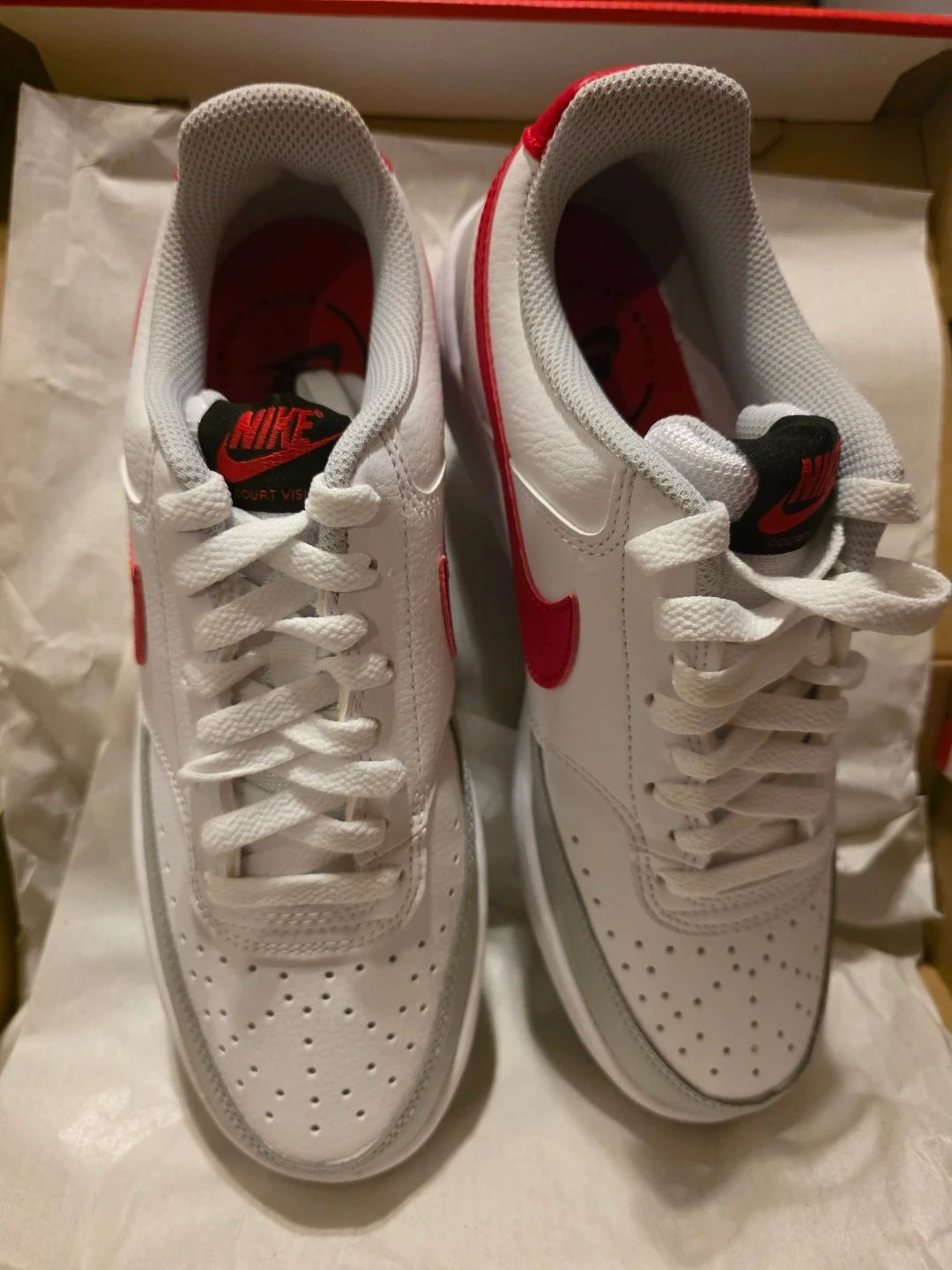 New Classic Nike Court Vision Low sneakers in white with red accents. Features a durable leather upper and rubber sole. Perfect for everyday wear! Cash only