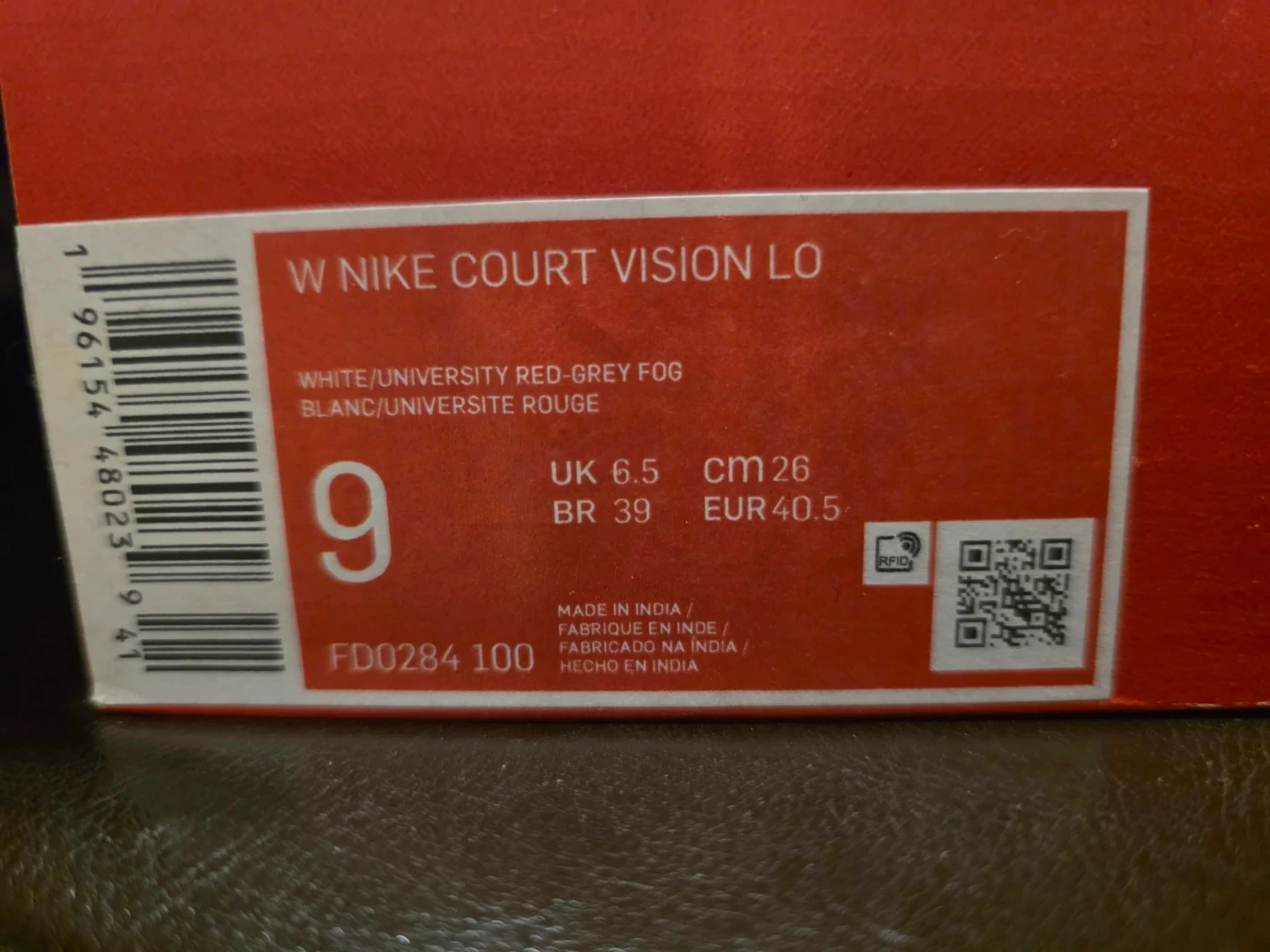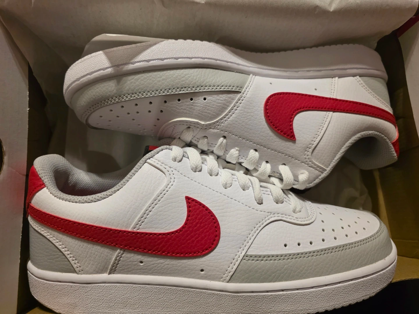 New Classic Nike Court Vision Low sneakers in white with red accents. Features a durable leather upper and rubber sole. Perfect for everyday wear! Cash only