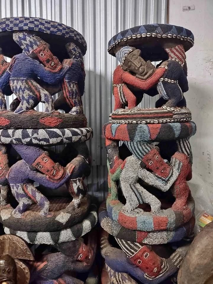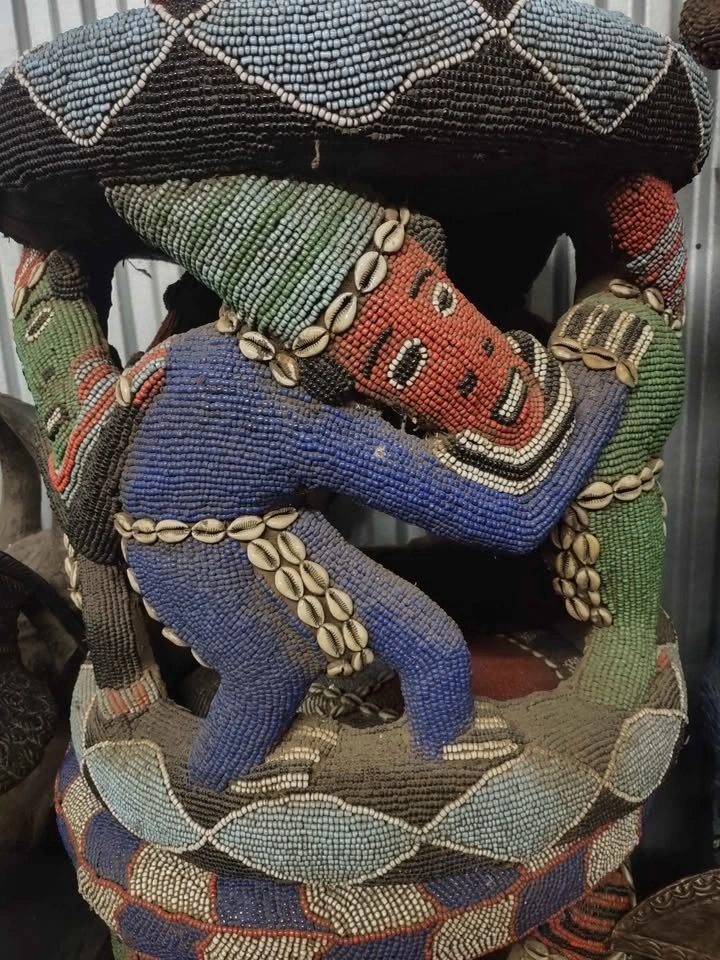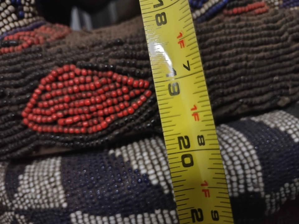 This is a beautiful royal stool from the Bamileke people of West Cameroon. It's decorated with intricate beadwork, showcasing traditional craftsmanship. A unique piece for your home decor.