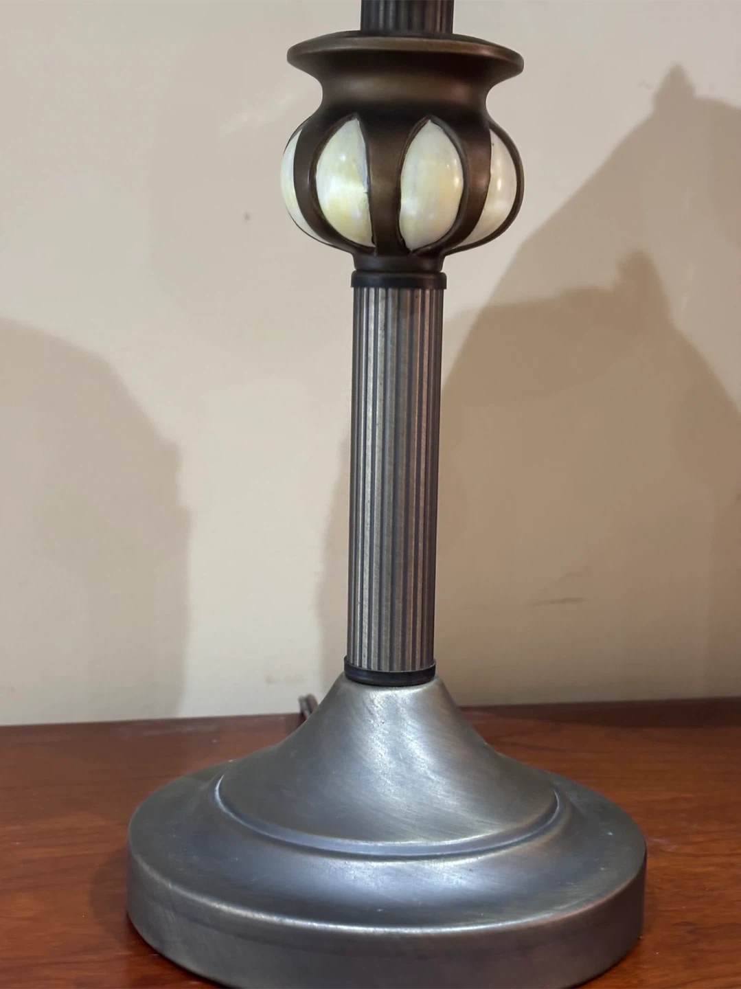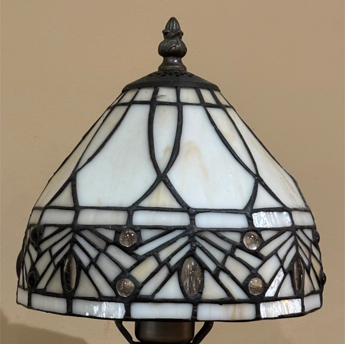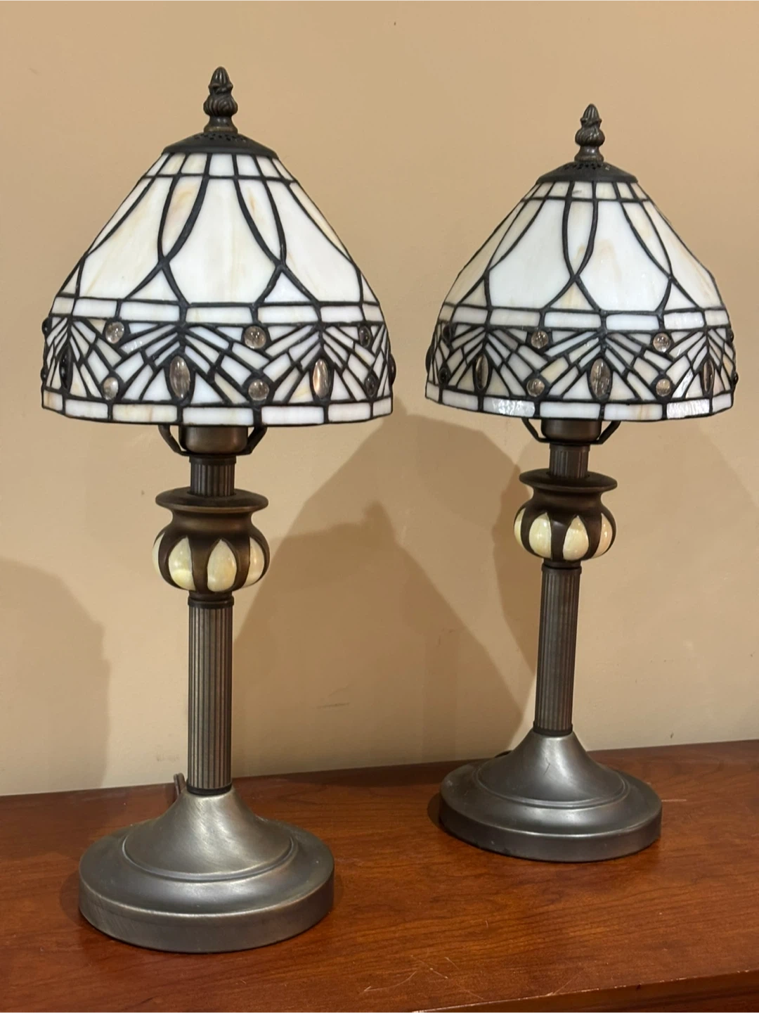 A beautiful pair of Tiffany style table lamps. Each lamp has a stained glass shade with a white and black pattern. The bases are metal with a ribbed design and a decorative element near the shade. They'd look nice on end tables or nightstands!