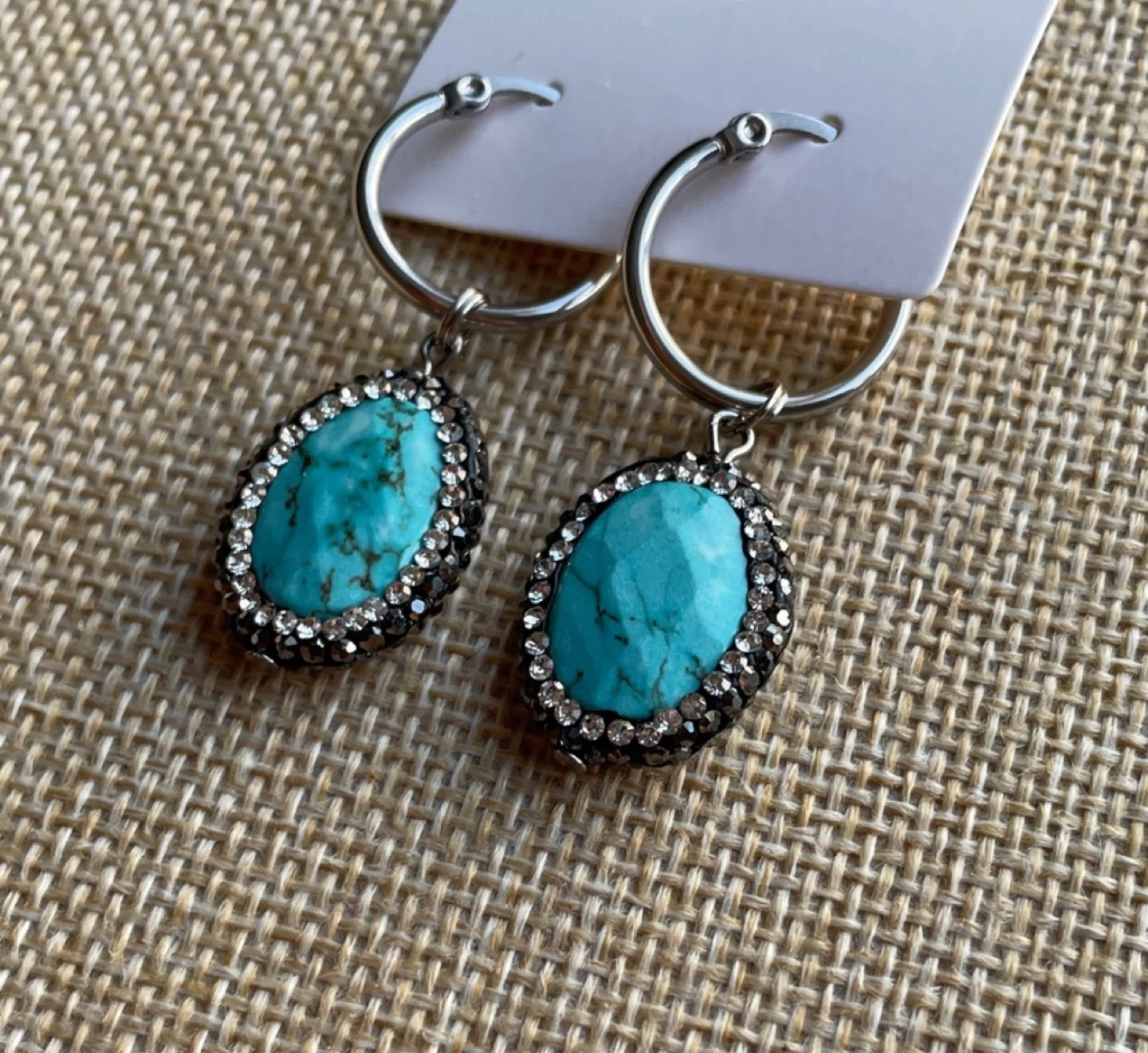 These stylish hoop earrings feature oval turquoise-coloured stones surrounded by sparkling rhinestones. The silver-toned hoops add a classic touch. They're perfect for adding a pop of colour to any outfit!