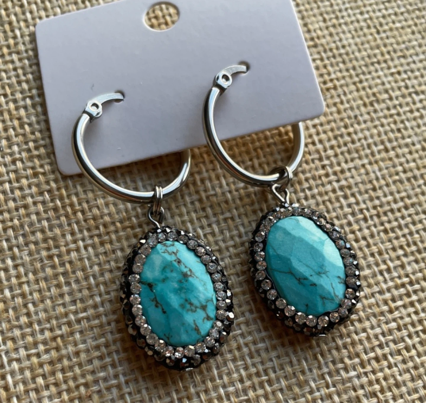 These stylish hoop earrings feature oval turquoise-coloured stones surrounded by sparkling rhinestones. The silver-toned hoops add a classic touch. They're perfect for adding a pop of colour to any outfit!