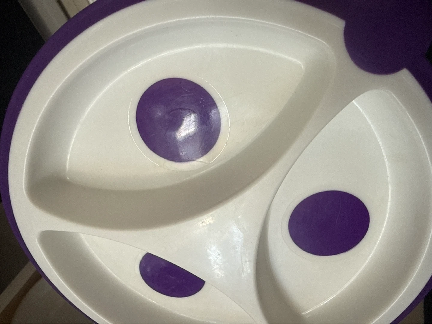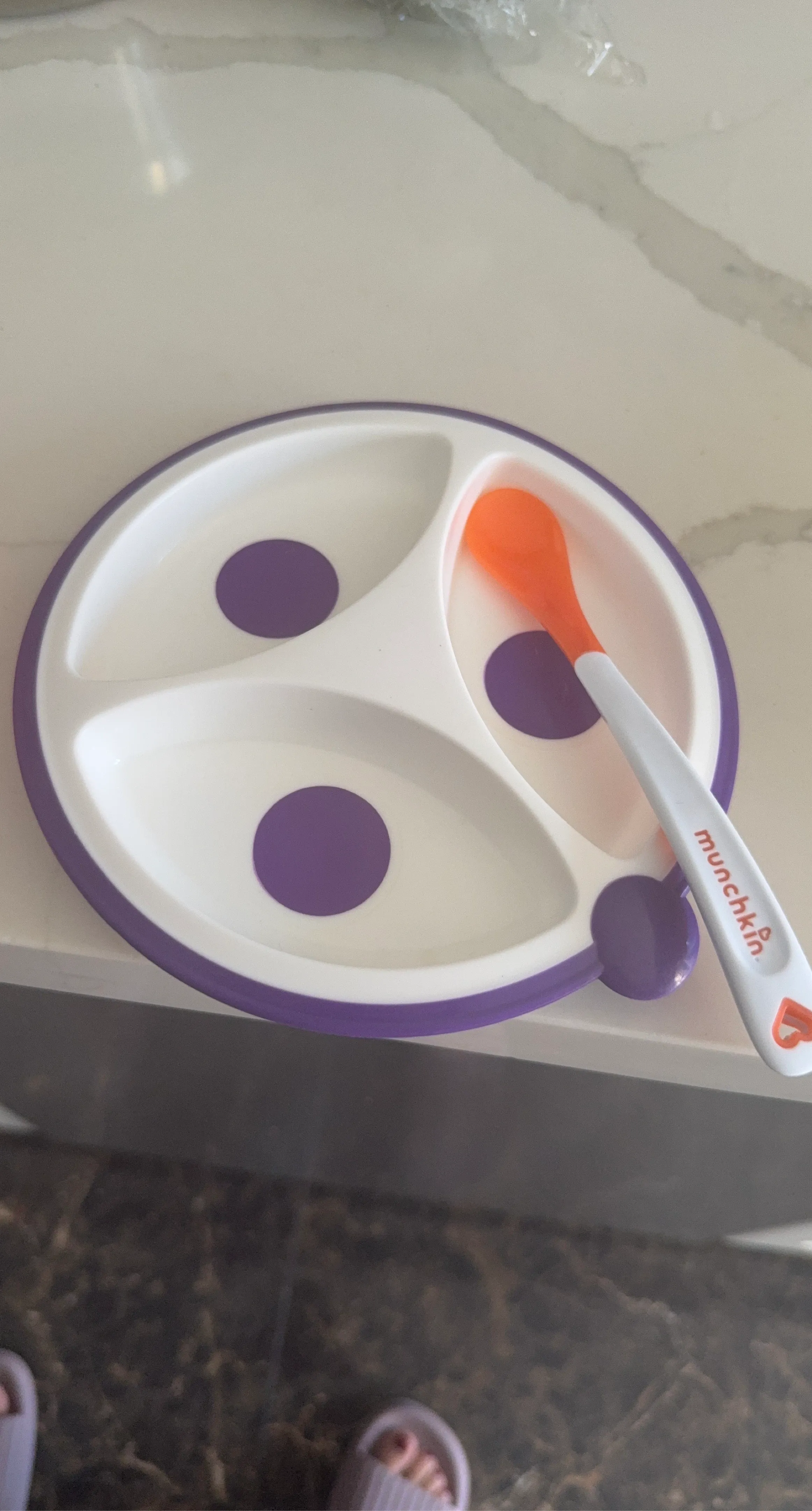This divided plate comes with an orange toddler spoon. It's designed with three compartments and purple suction cups on the bottom to help prevent spills.