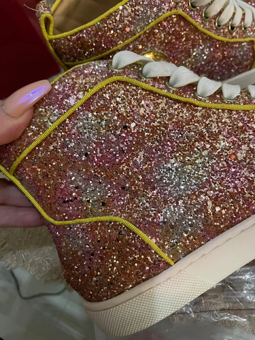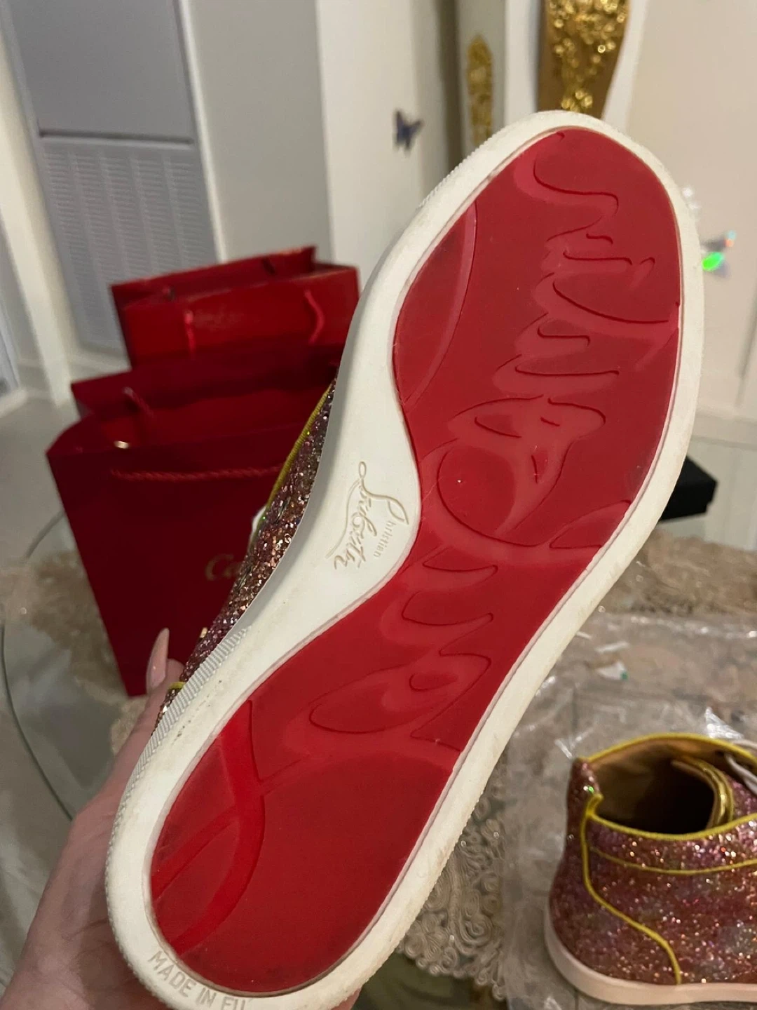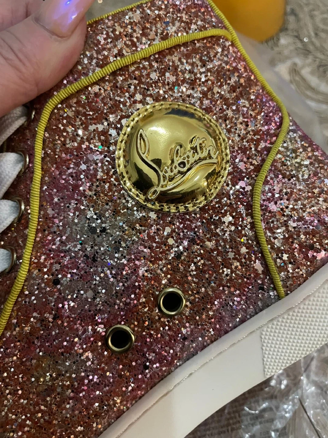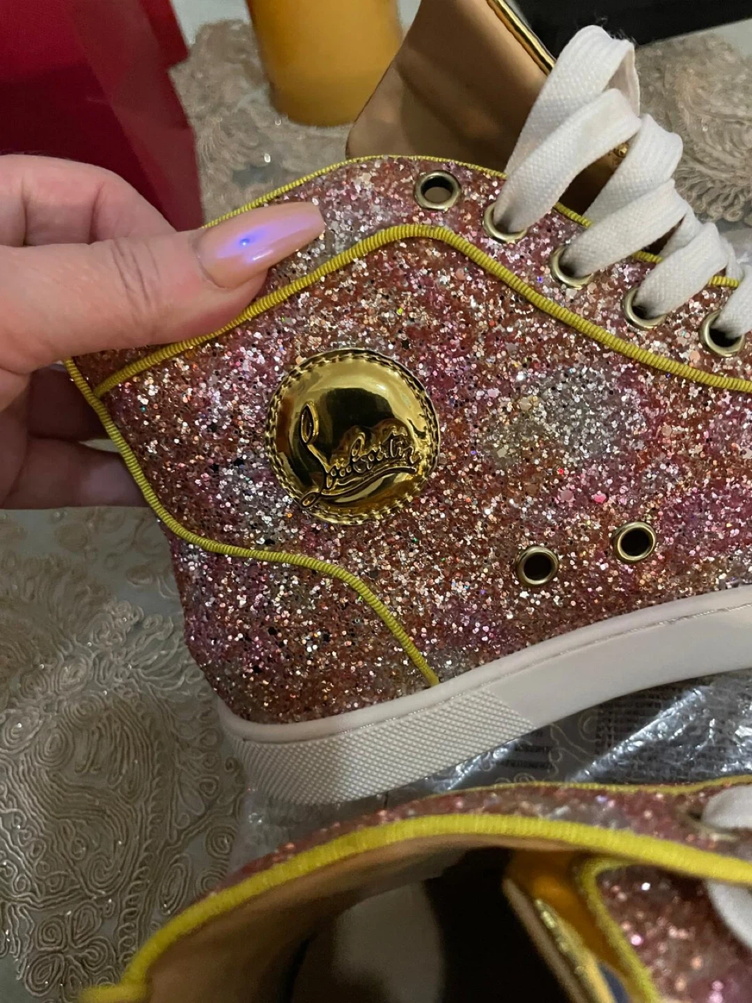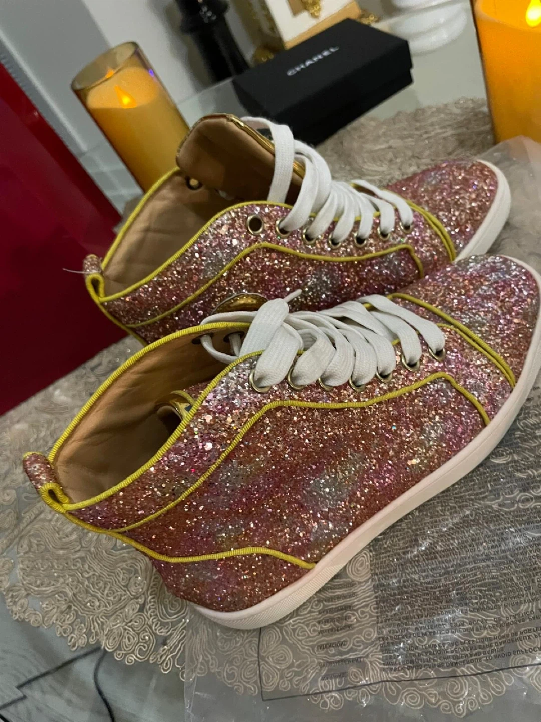 Pink sparkle with a little silver and a touch of gold LOUBOUTINS high top running shoes no box the box got destroyed only worn in the house to try on two small for me. They are a size 9, which is like an eight 8 1/2.