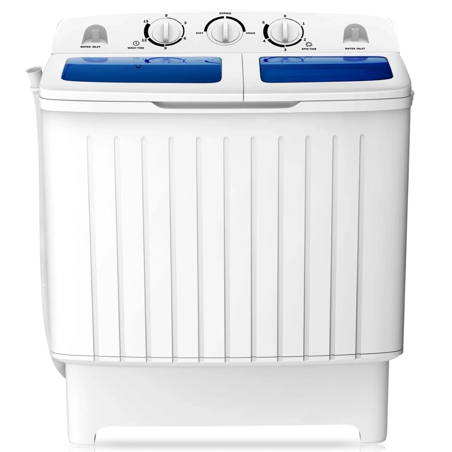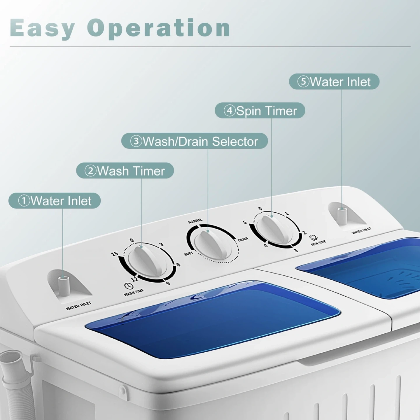 This is a twin tub washing machine with separate tubs for washing and spinning. It has a wash timer up to 15 minutes and a spin timer up to 5 minutes. The wash timer has a 'Normal' and 'Soft' setting. Great for small loads of laundry!