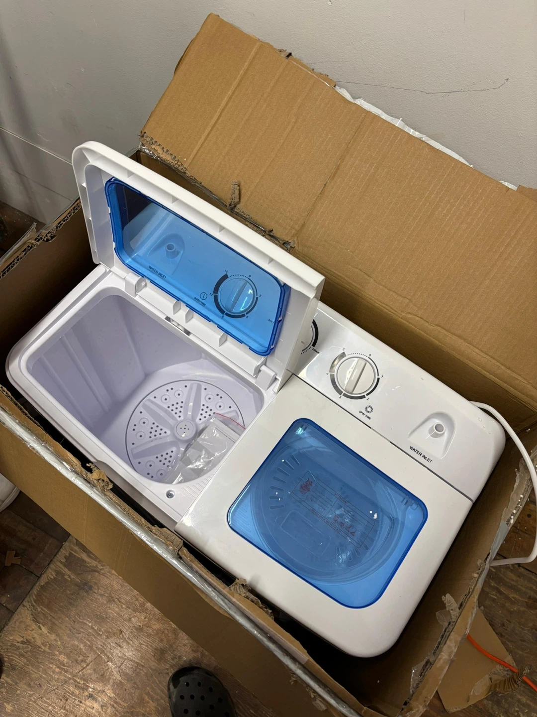 This is a twin tub washing machine with separate tubs for washing and spinning. It has a wash timer up to 15 minutes and a spin timer up to 5 minutes. The wash timer has a 'Normal' and 'Soft' setting. Great for small loads of laundry!