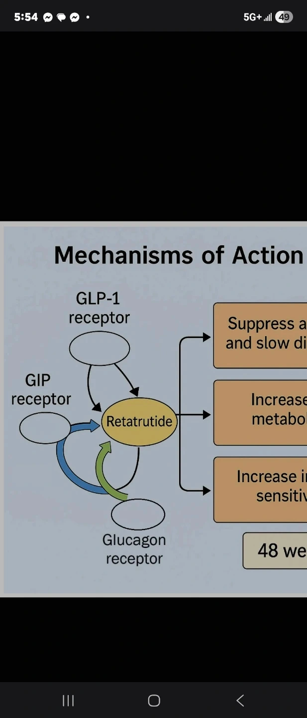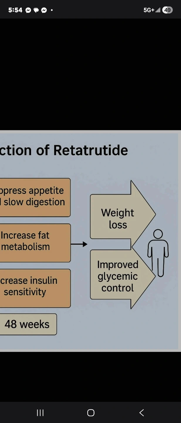Retatrutide is an once-weekly "triple G" agonist (and Glucagon receptors) developed by Eli Lilly that has demonstrated significant weight loss (up to ~24% over 48 weeks) and improved metabolic markers. It is considered a potential next-generation obesity treatment that may surpass current medications in efficacy Mechanism of Action: By targeting three hormone receptors instead of one (like semaglutide) or two (like tirzepatide), it increases energy expenditure alongside appetite reduction. Research indicates substantial weight reductions, with some participants losing up to 24.2% of body weight after 48 weeks. have shown consistent weight loss and significant reductions in HbA1c in patients with type 2 diabetes.