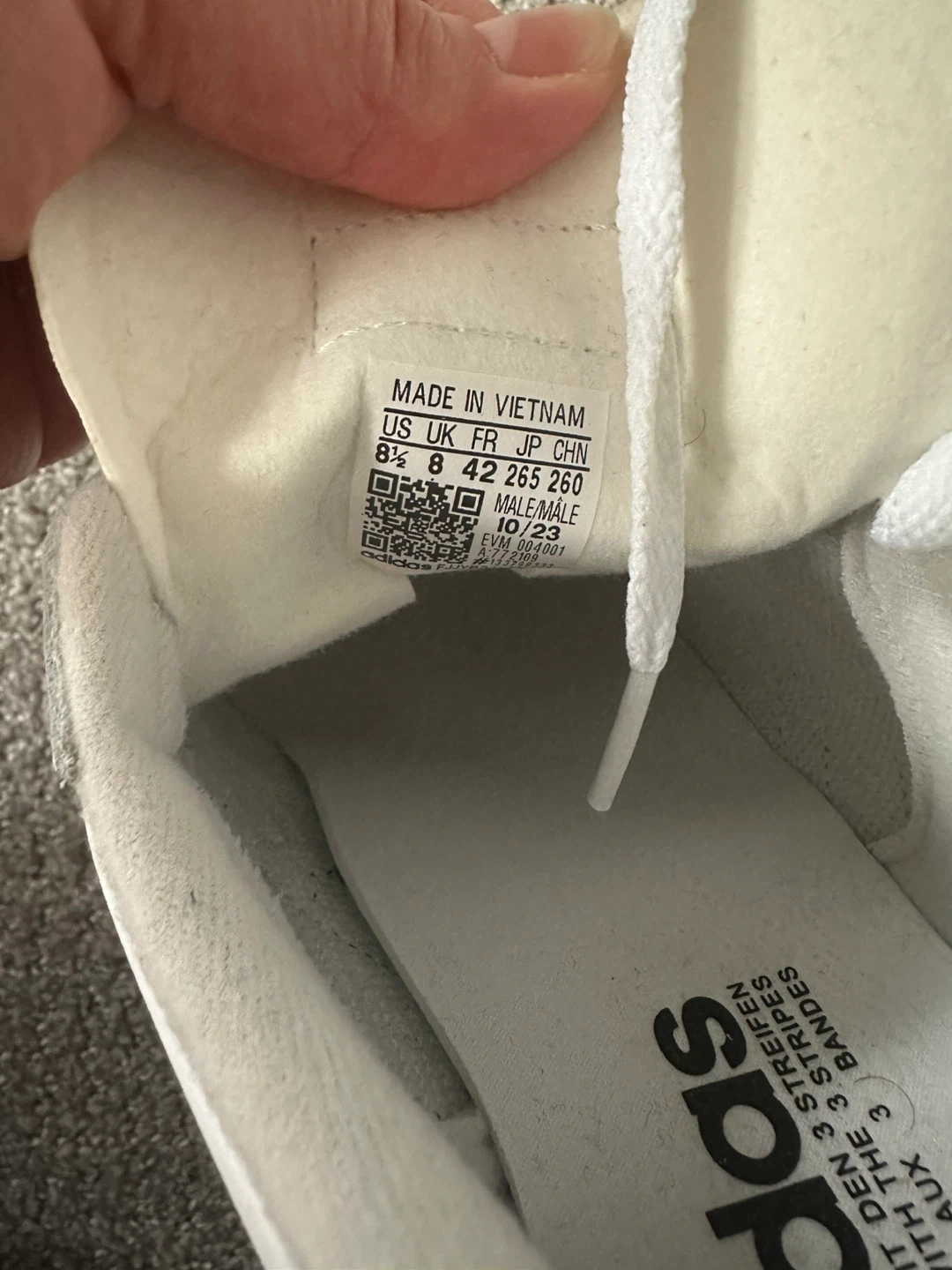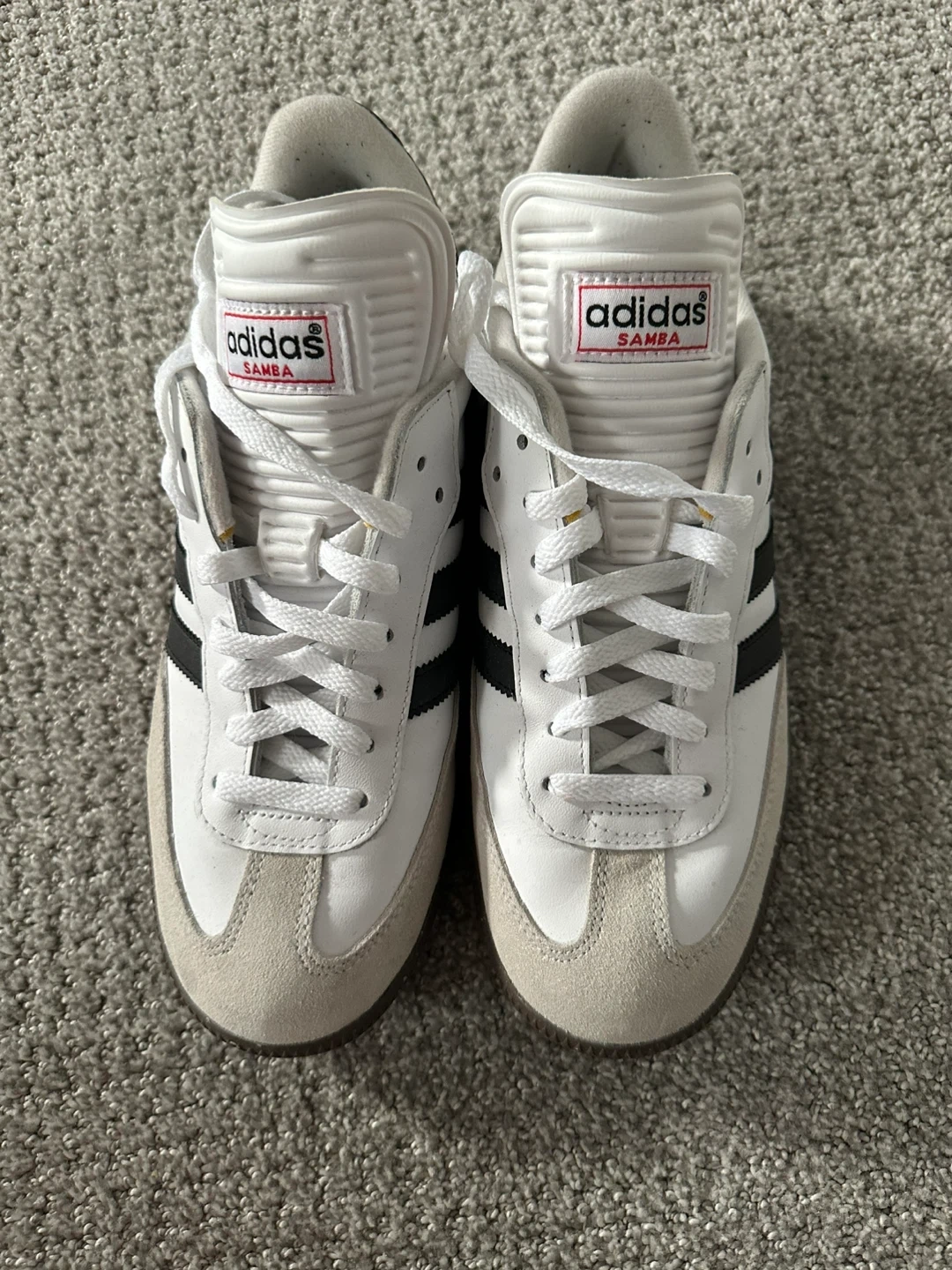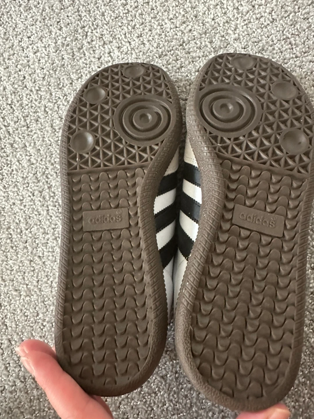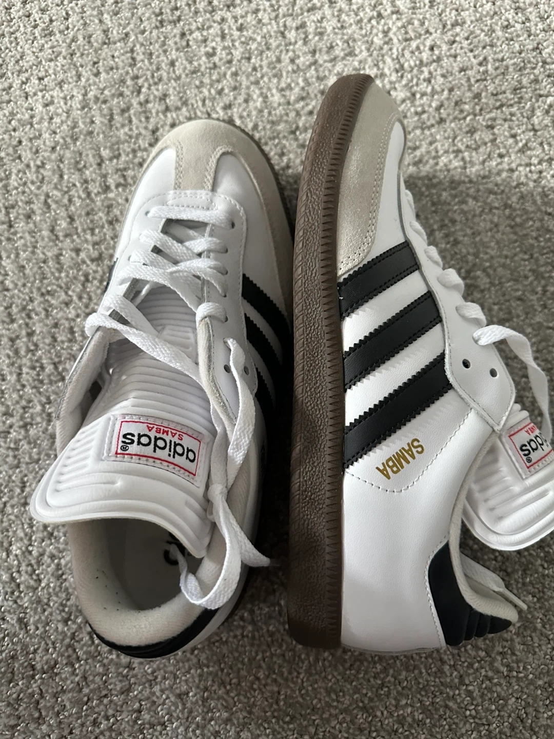 Adidas Samba classic sneakers in white with black stripes. Leather and suede upper with rubber sole. Made in Vietnam. Worn only once.