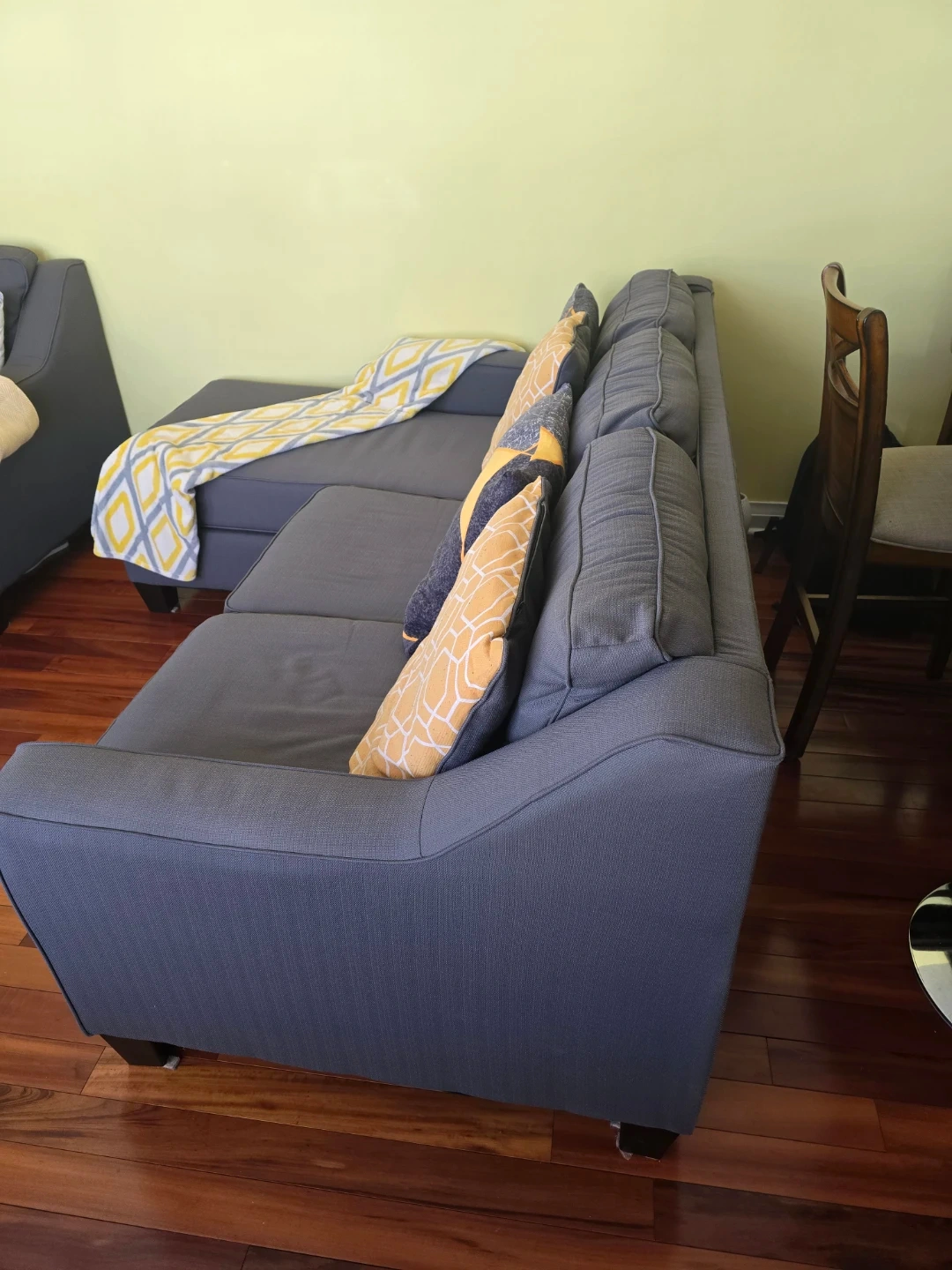 This is a stylish grey sectional sofa that comes with three decorative accent pillows. The pillows feature a modern design with yellow and grey geometric patterns. It's a comfortable addition to any living space.