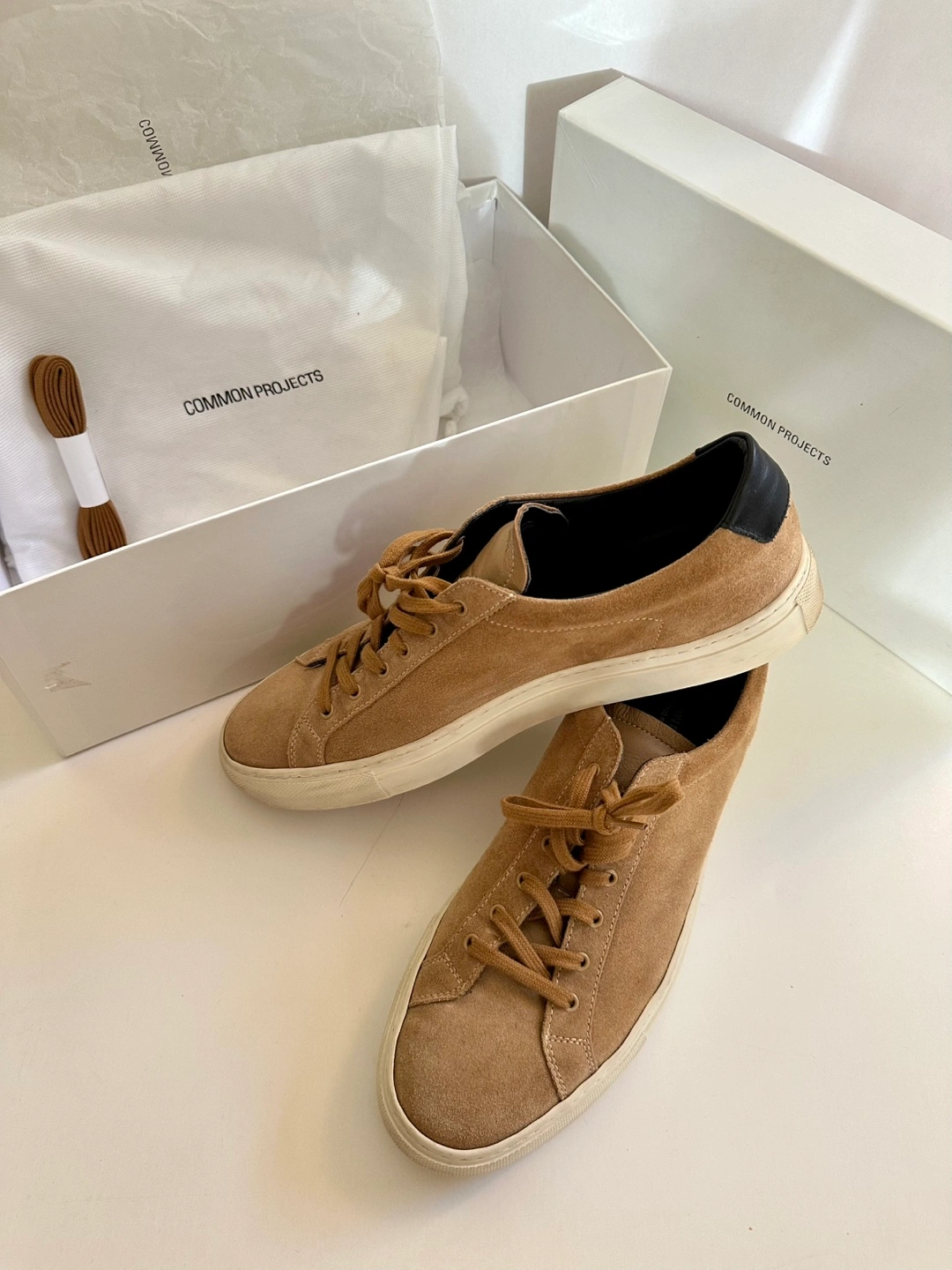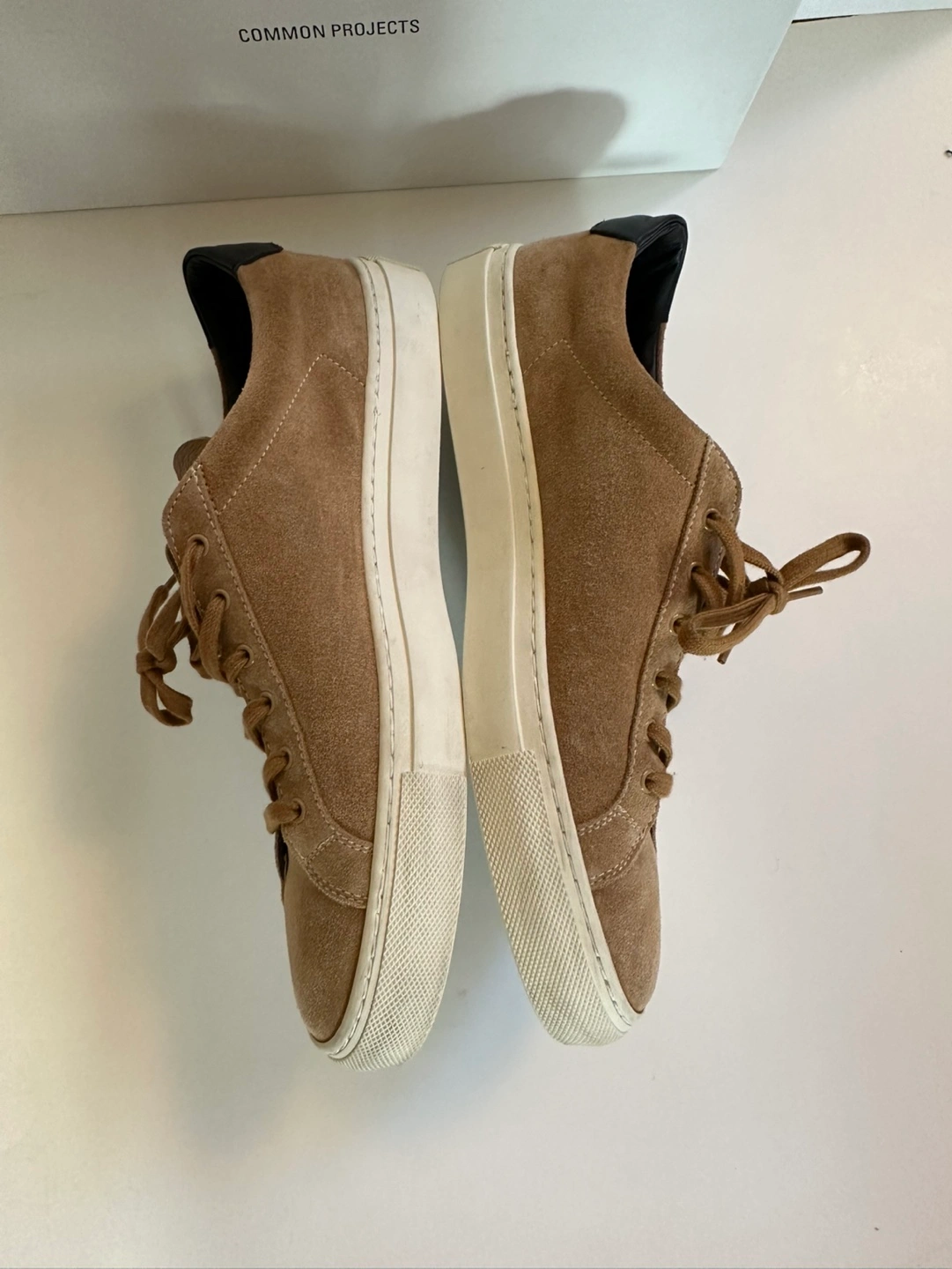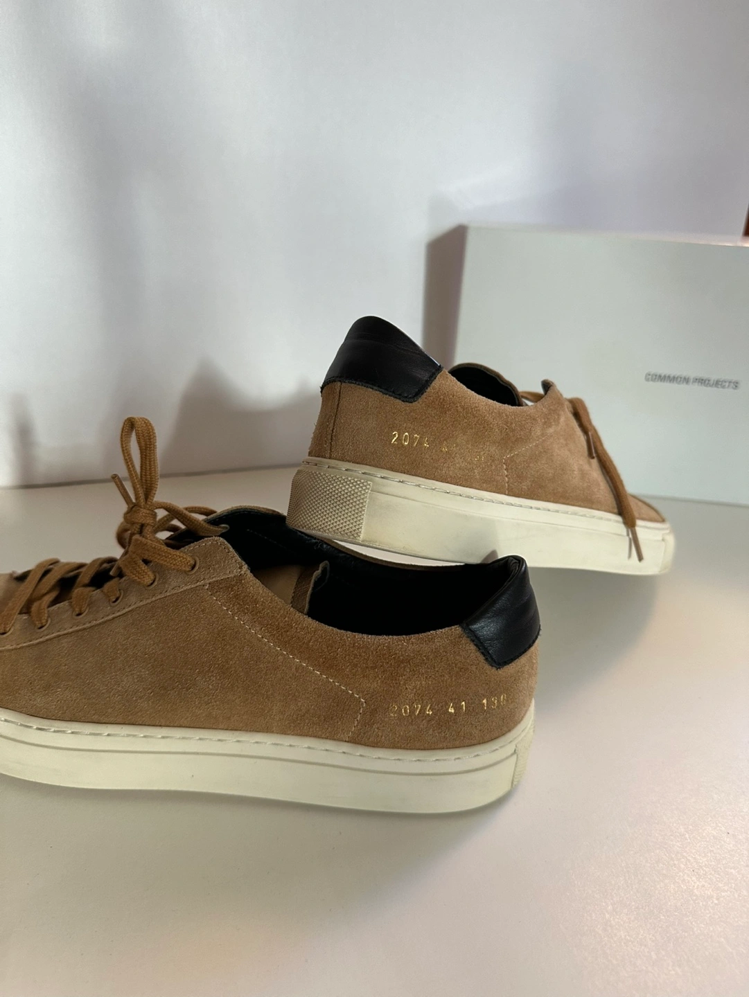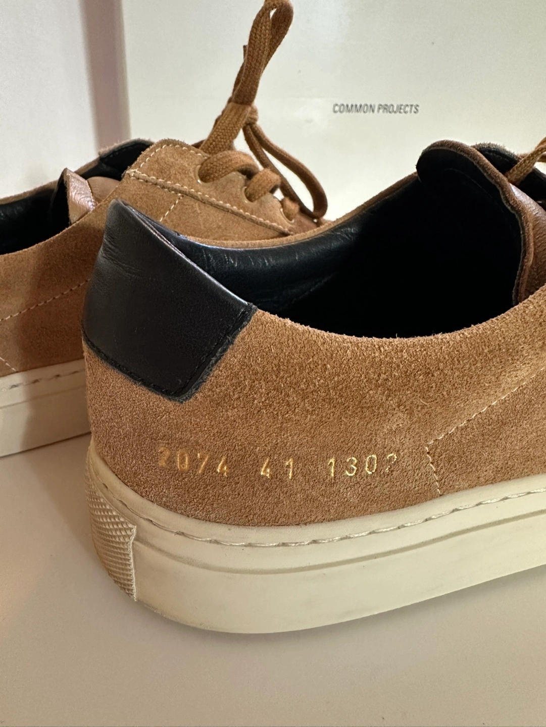 Tan suede Common Projects sneakers.