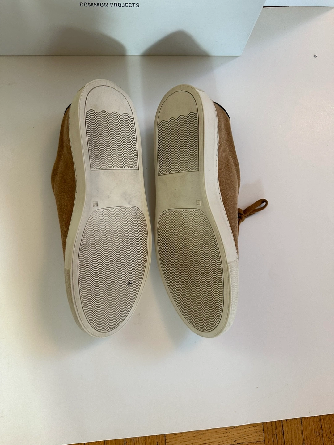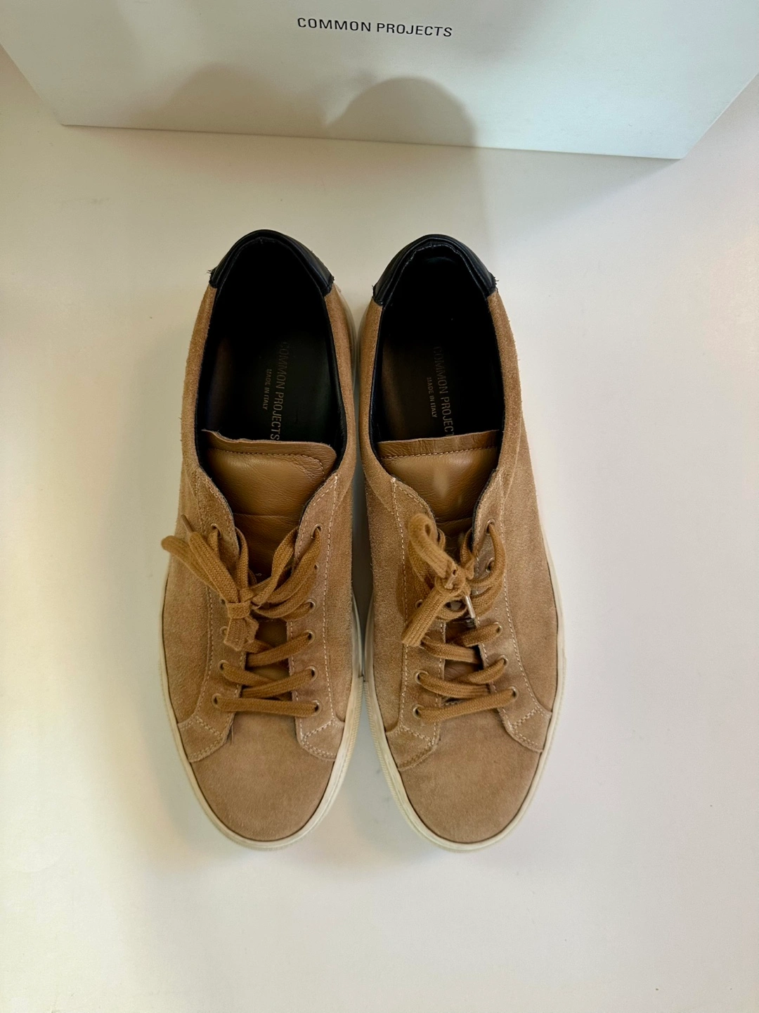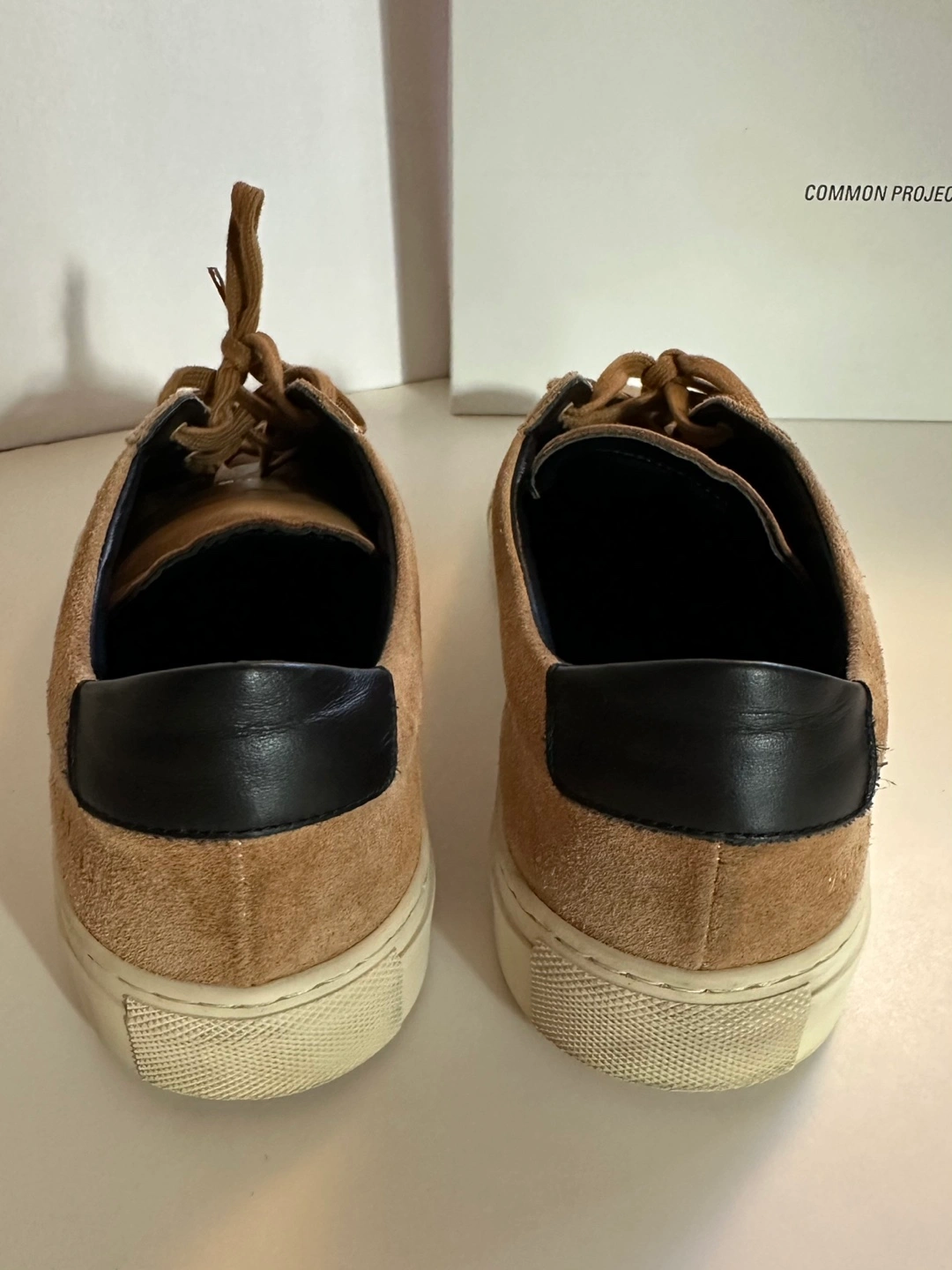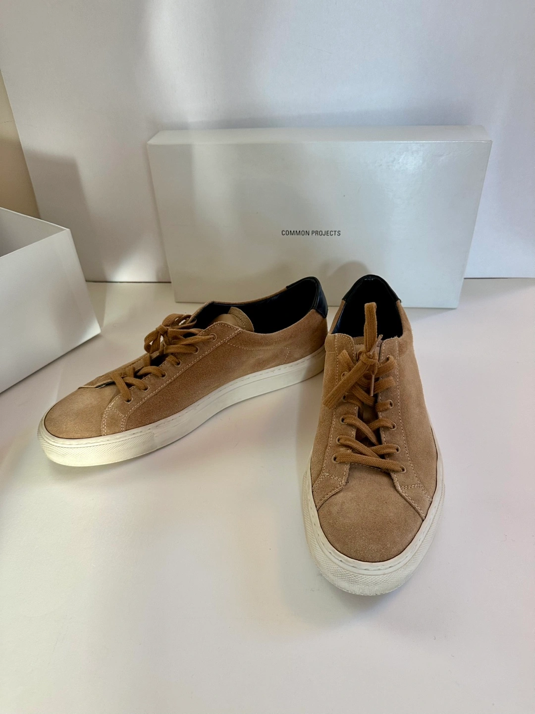 Tan suede Common Projects sneakers.