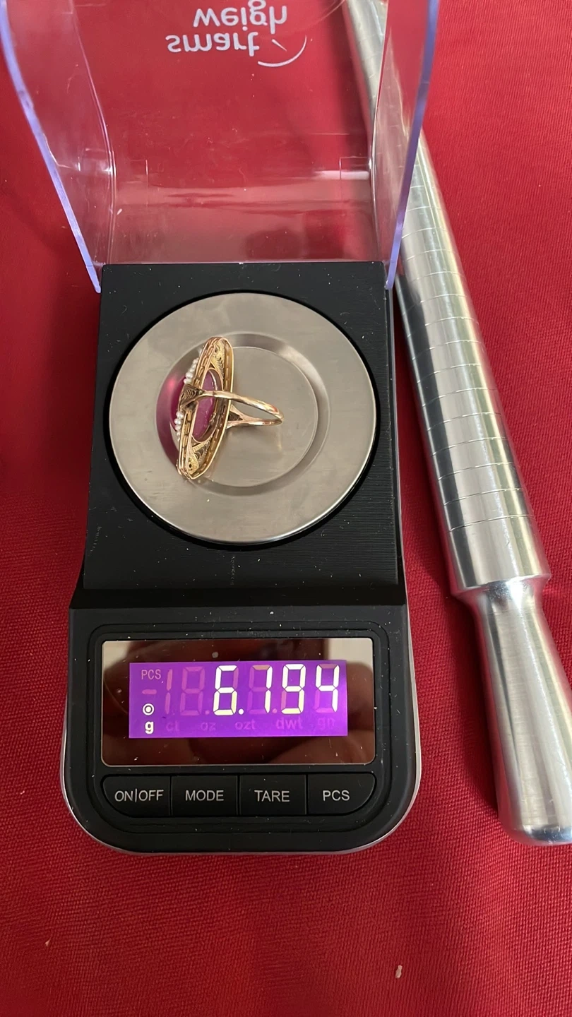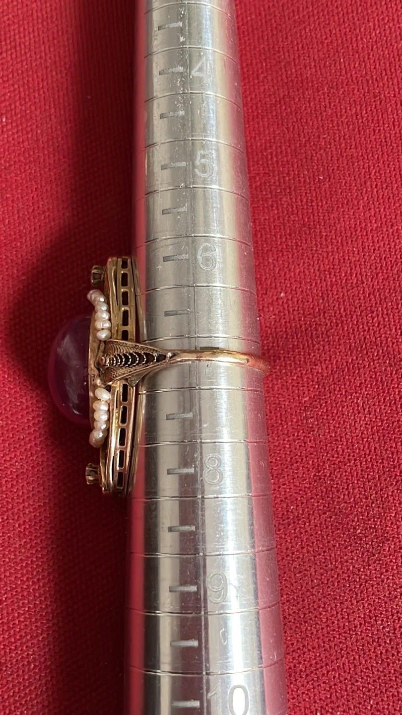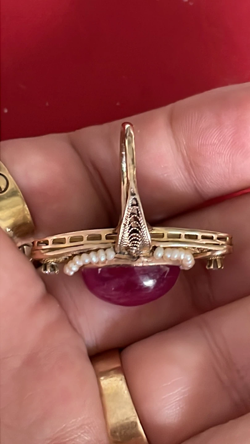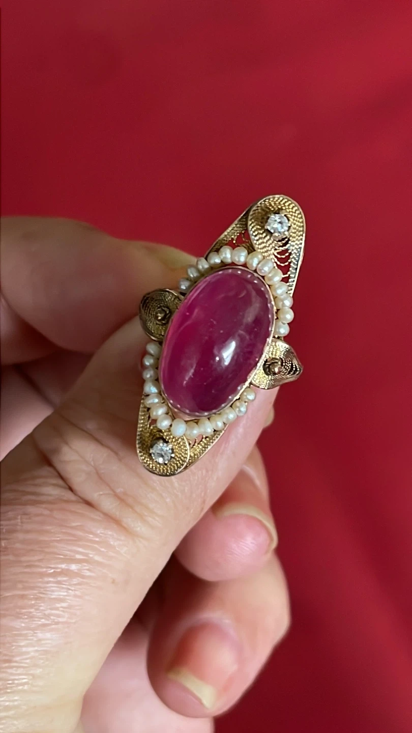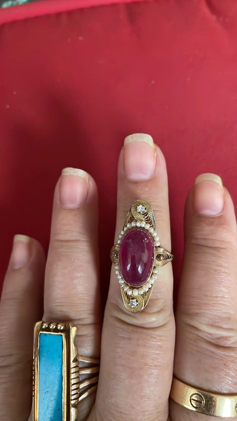 Stunning 10k vintage ring featuring a large pink cabochon ruby, accented with seed pearls , diamonds and delicate gold filigree. It's a beautiful statement piece for any occasion.