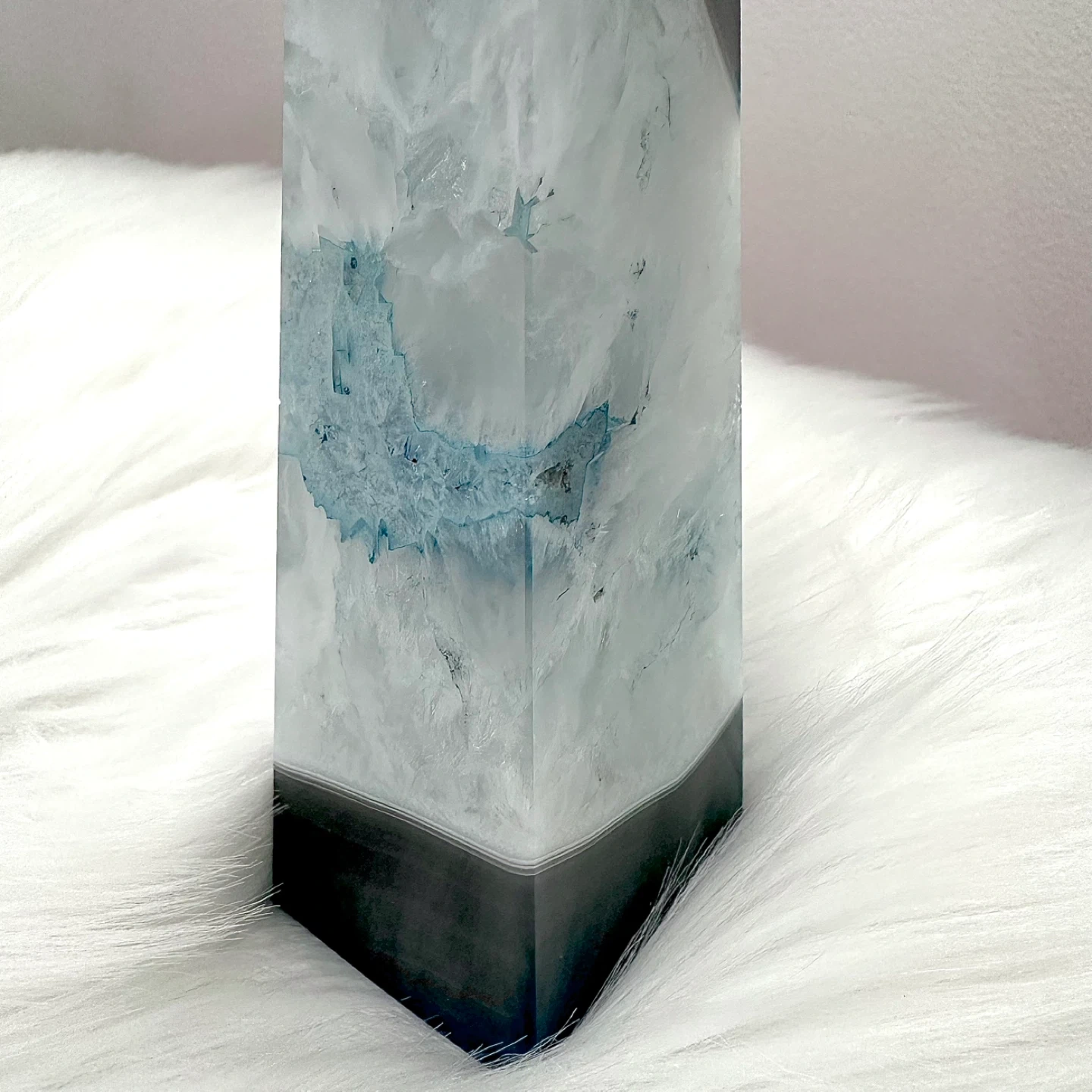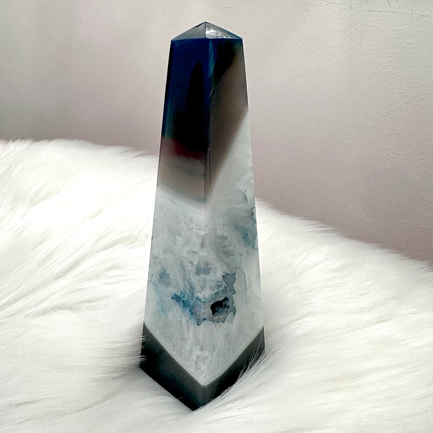 Brazilian polished blue agate obelisk crystal measuring 1.5” wide x 1.75” long x 6” tall — no damage