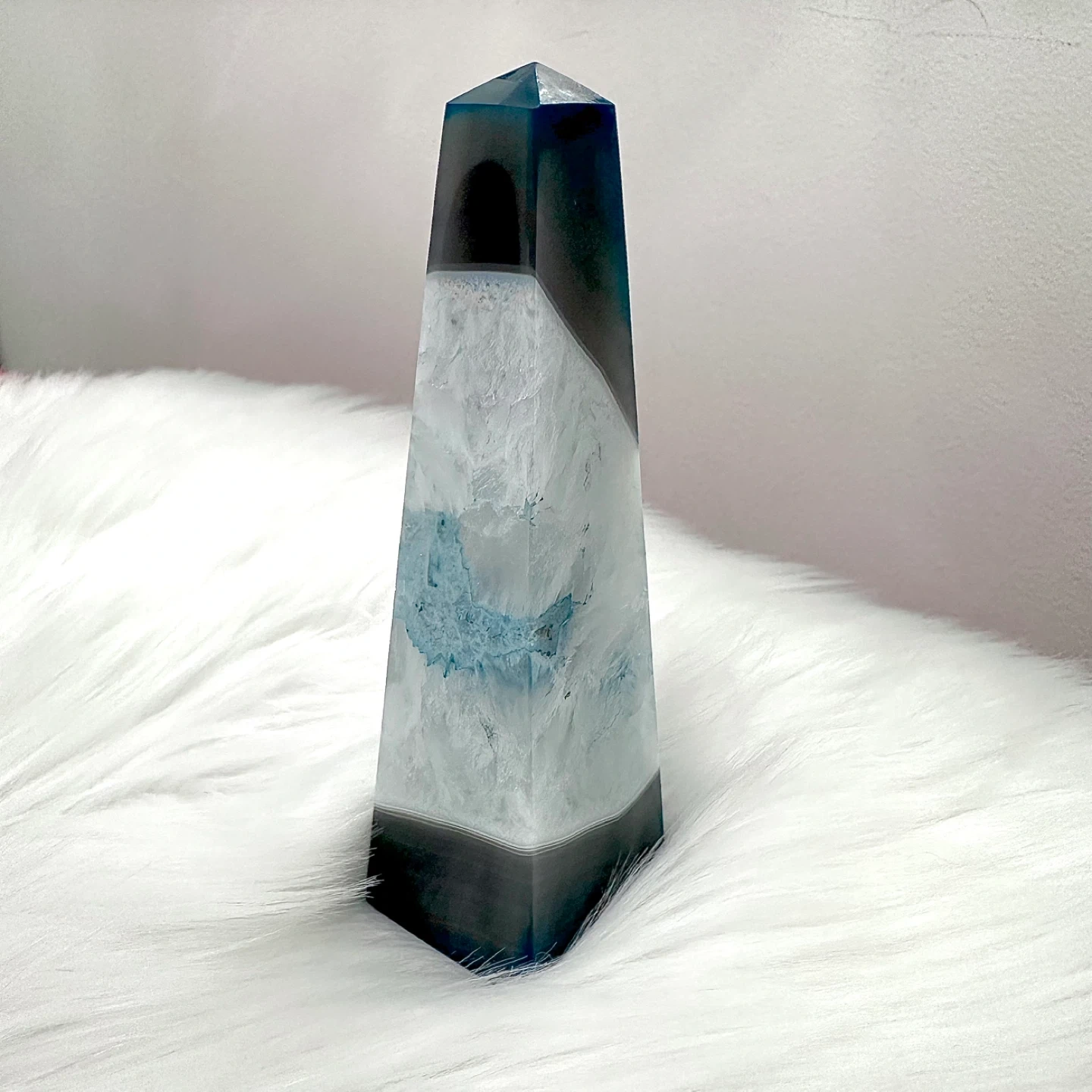 Brazilian polished blue agate obelisk crystal measuring 1.5” wide x 1.75” long x 6” tall — no damage