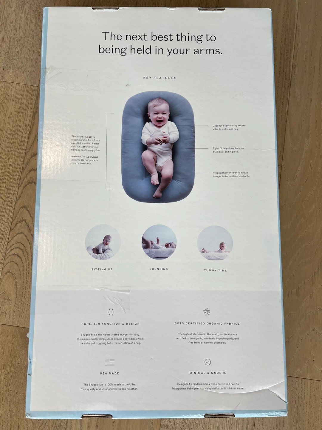 Selling a Snuggle Me infant lounger made with certified organic fabrics! It's designed to give baby the sensation of a hug. The unpadded centre sling causes sides to pull in and hug, and the tight fit helps keep baby on their back and in place.