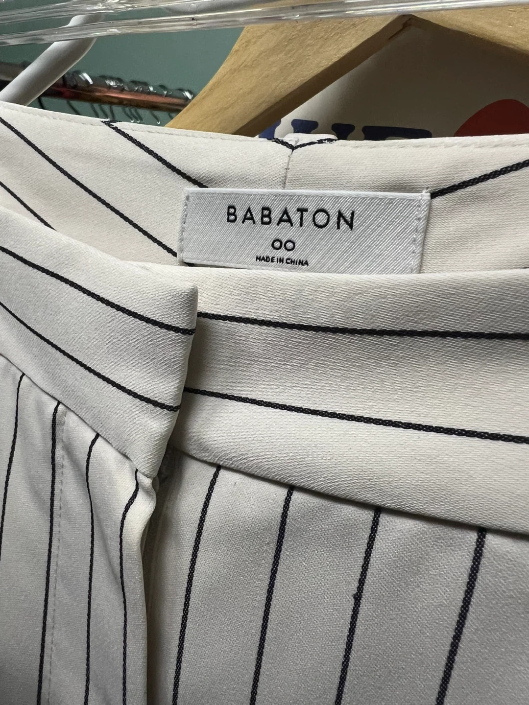 These Babaton trousers feature a classic pinstripe pattern. They are a size 00. These pants offer a professional and chic look. I have a matching top for $50.