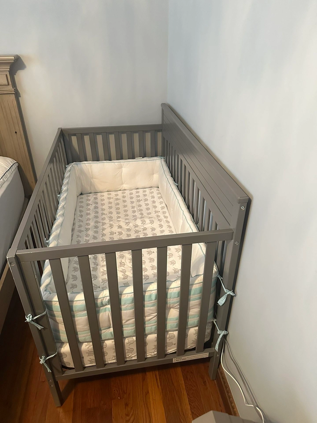Like new grey baby crib in very good condition for sale. Includes the mattress also.