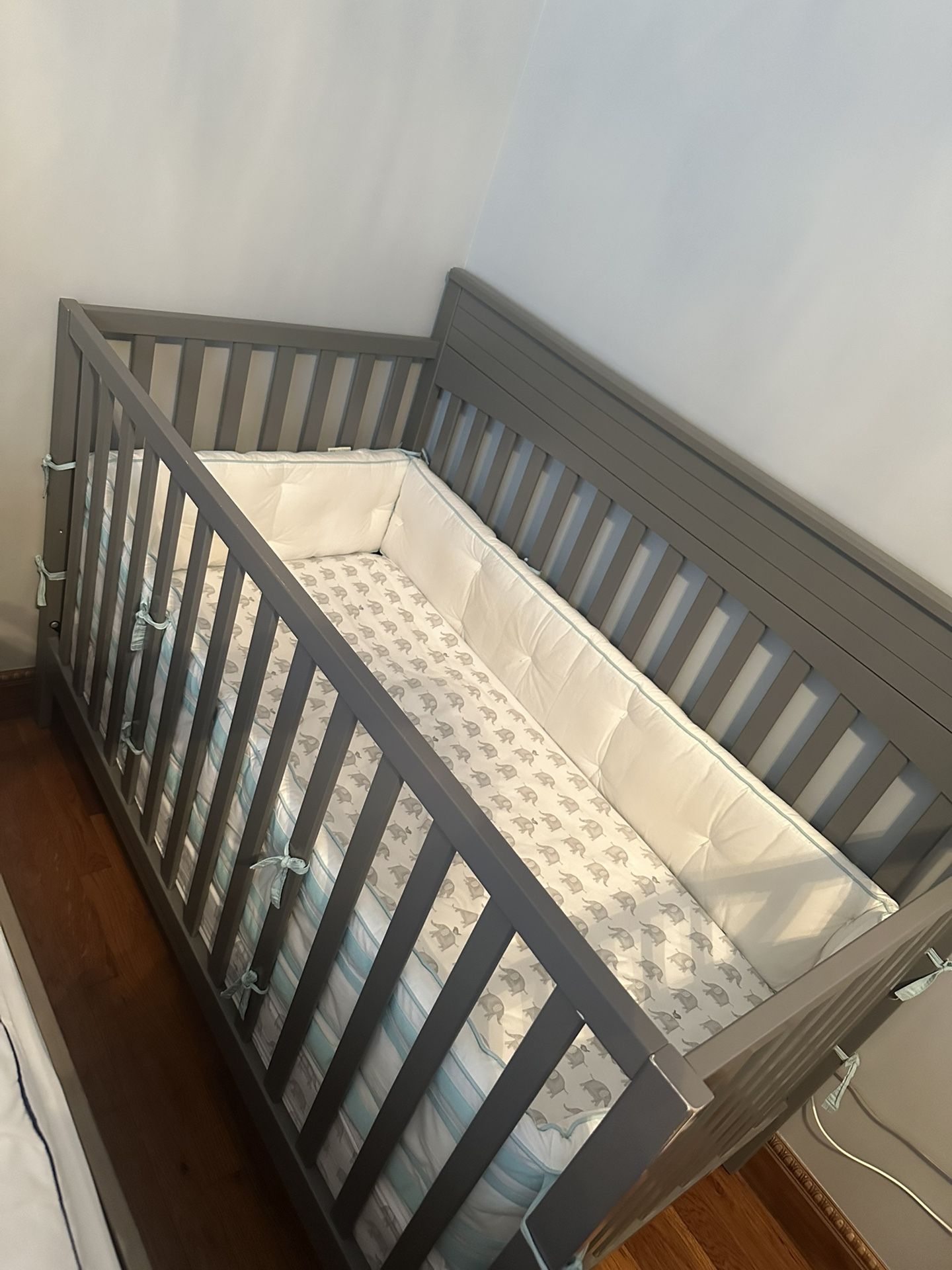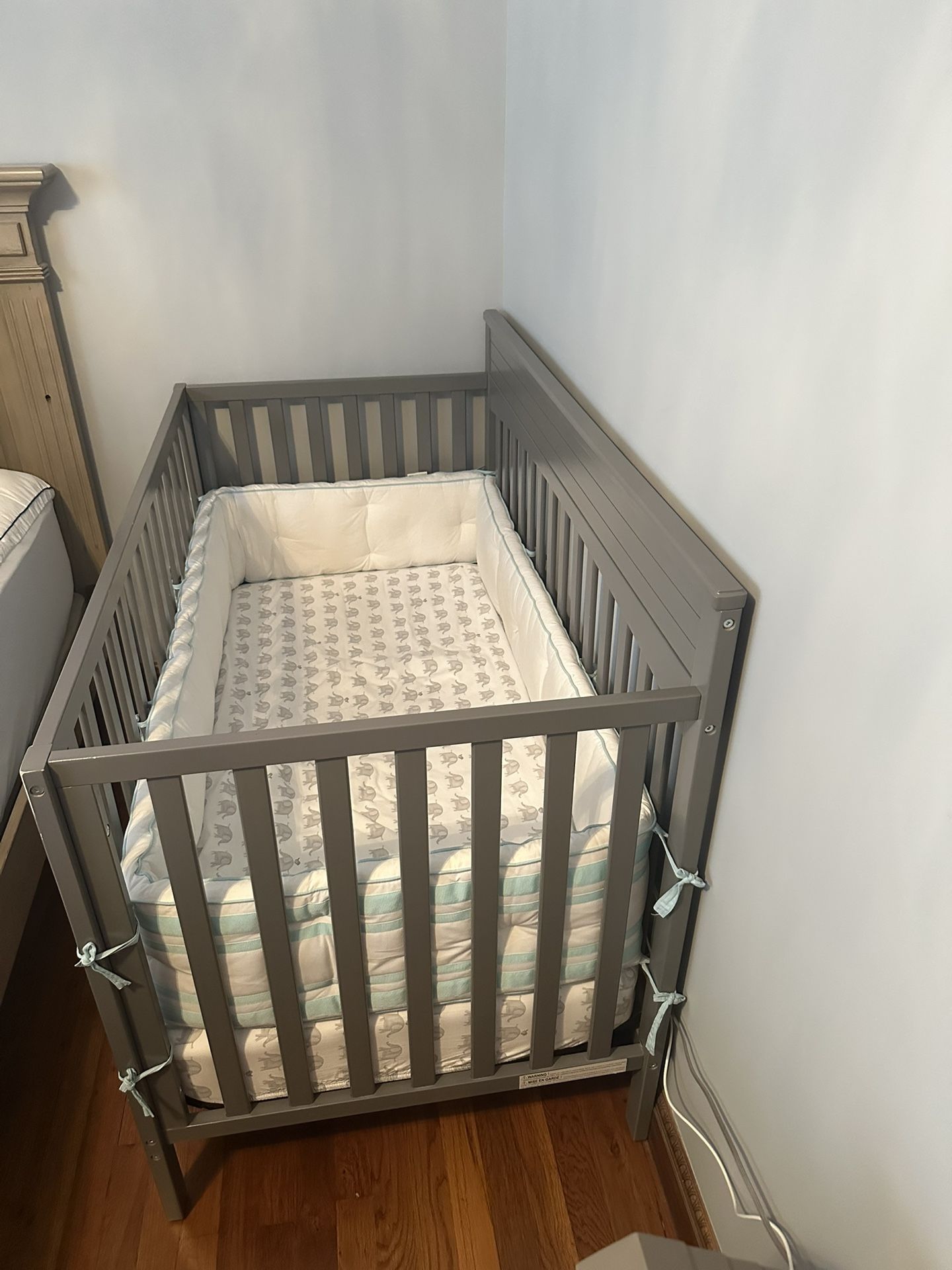 Like new grey baby crib in very good condition for sale. Includes the mattress also.