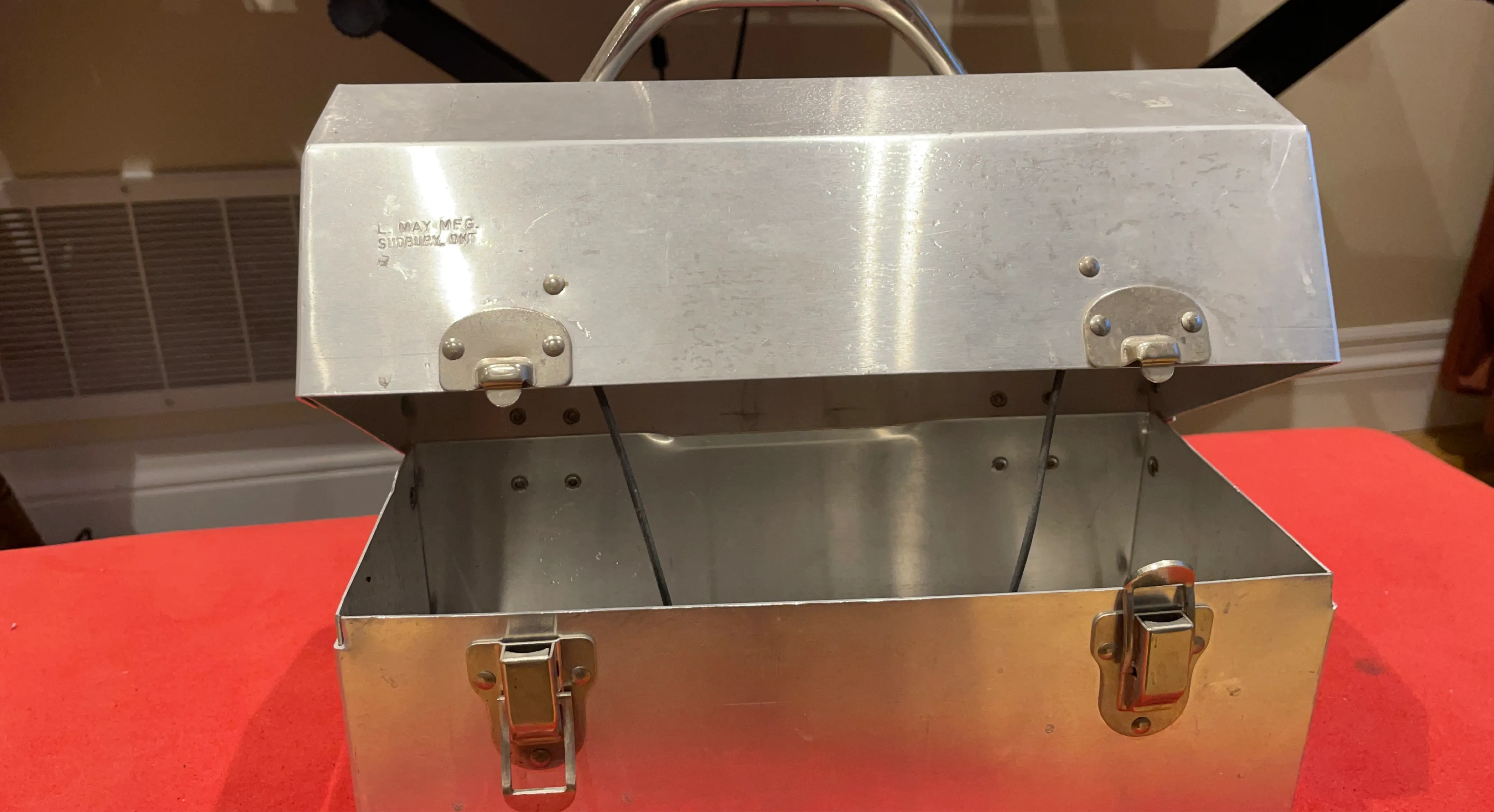 Classic metal lunch box by L. May Mfg. of Sudbury, Ontario. It features a durable aluminum construction with secure latches. Perfect for carrying lunches or storing small items!