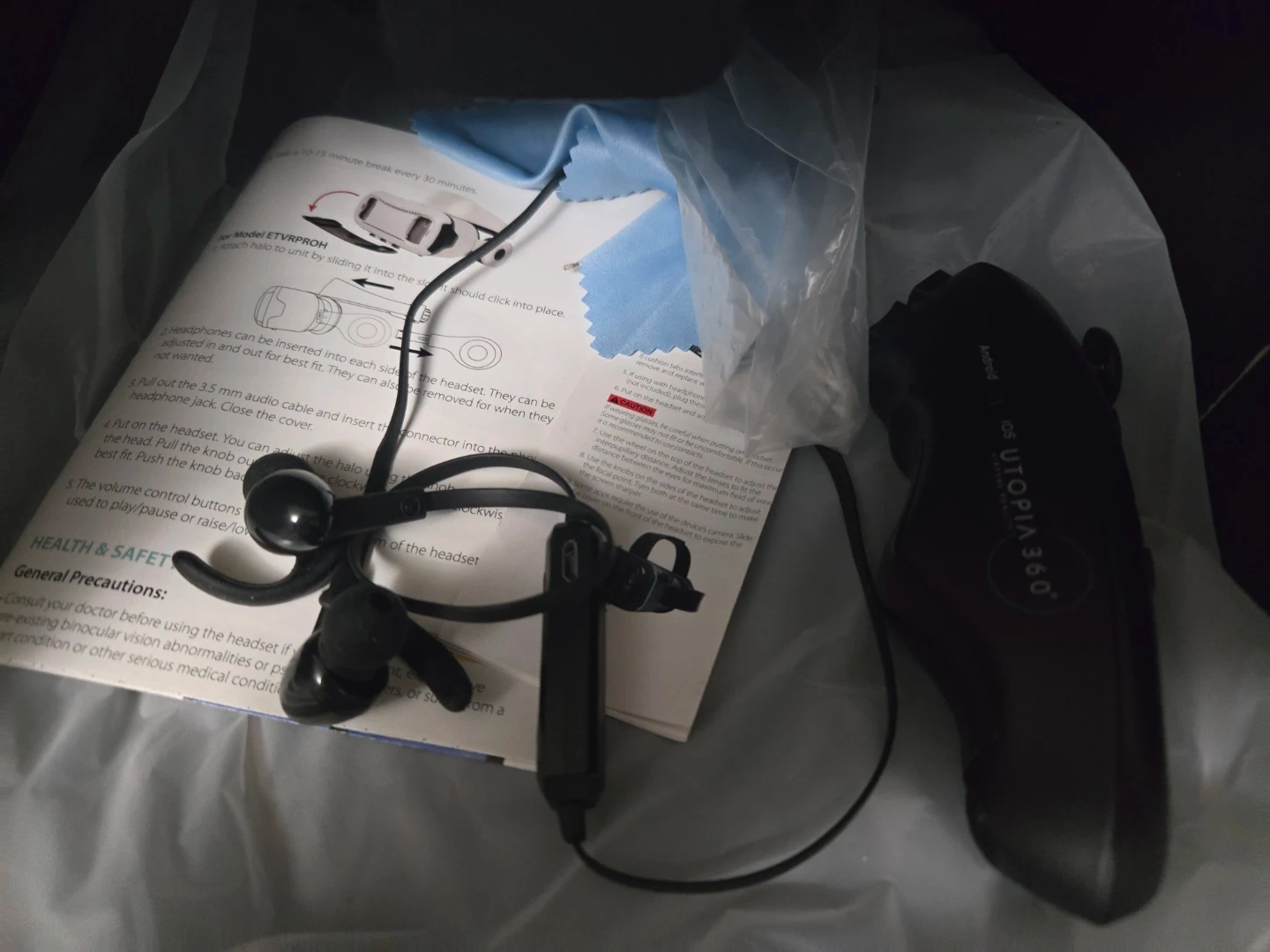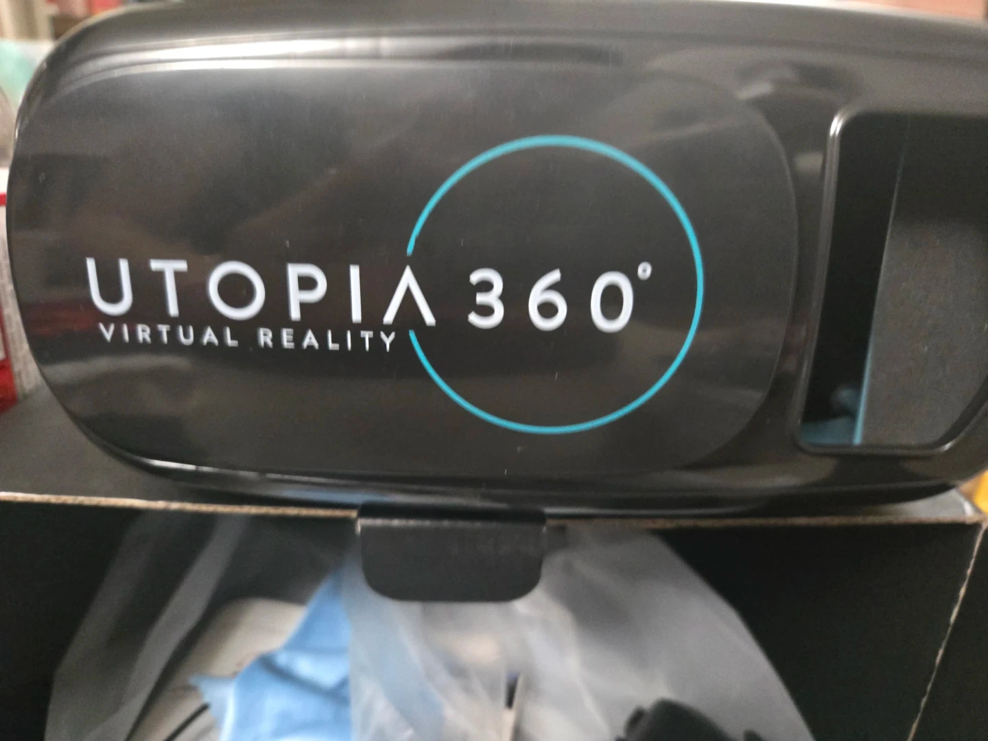 This Utopia 360 virtual reality headset comes with a controller and headphones. It includes a cleaning cloth and user manual. Experience immersive virtual worlds!