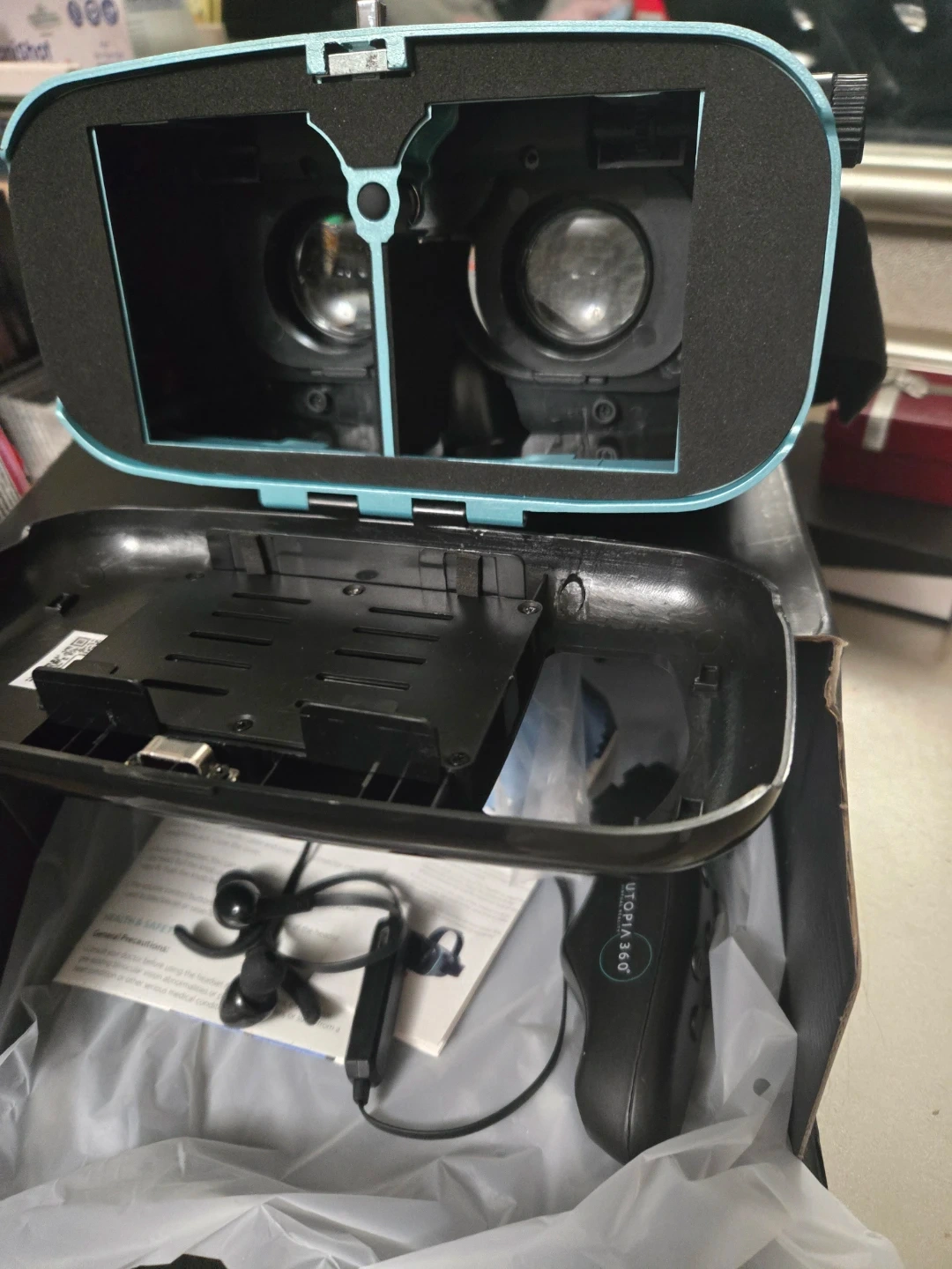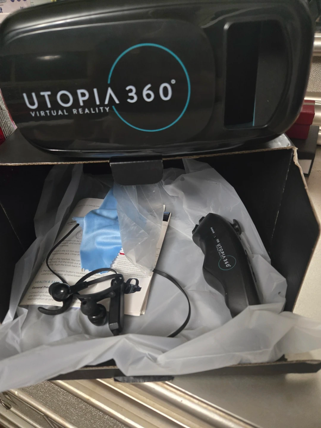 This Utopia 360 virtual reality headset comes with a controller and headphones. It includes a cleaning cloth and user manual. Experience immersive virtual worlds!