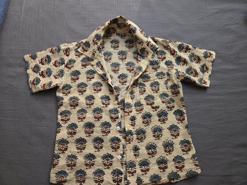 Selling a cute floral print shirt. The shirt features a unique floral pattern in shades of blue and red on a beige background. The size is 24. It's in great condition and ready for a new home!