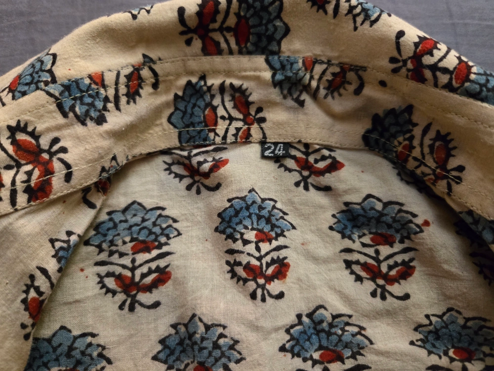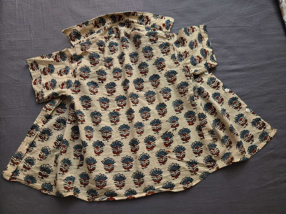 Selling a cute floral print shirt. The shirt features a unique floral pattern in shades of blue and red on a beige background. The size is 24. It's in great condition and ready for a new home!